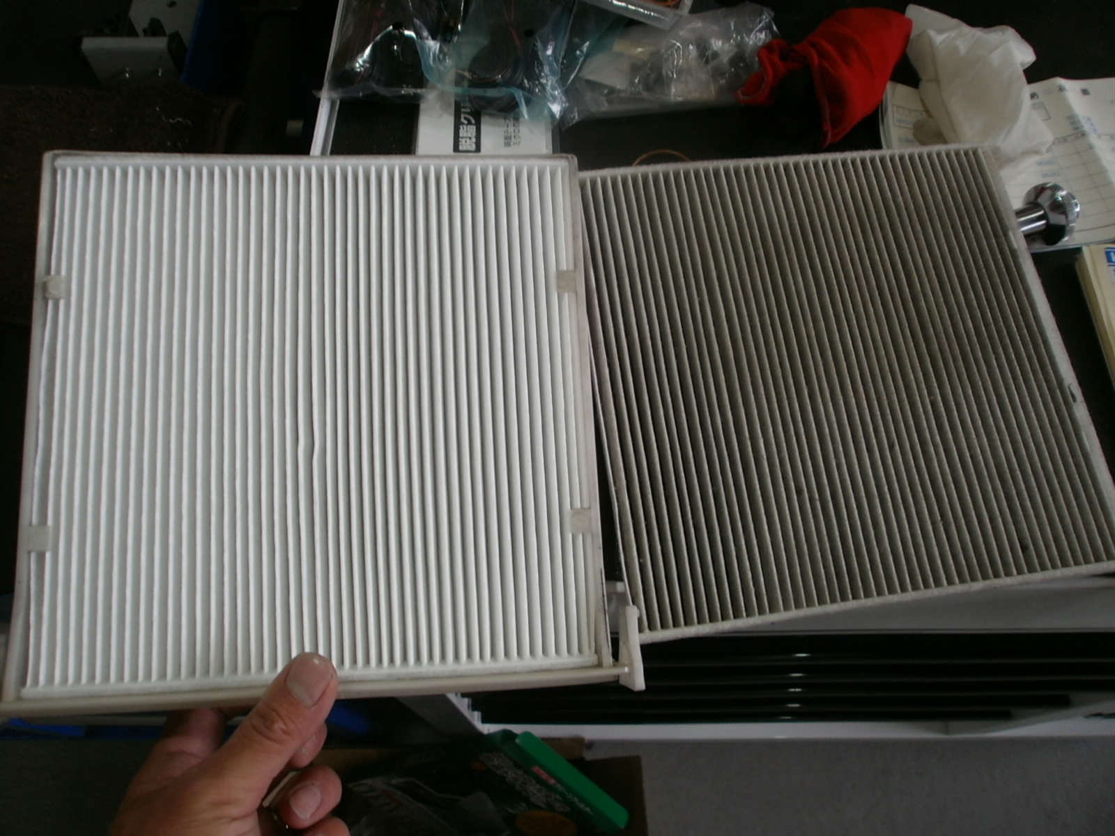 エアコンフィルターが汚れによる目詰まりをしていました。新旧を見てください、定期的に交換し、車内をいつも綺麗な空気に(*^^*)