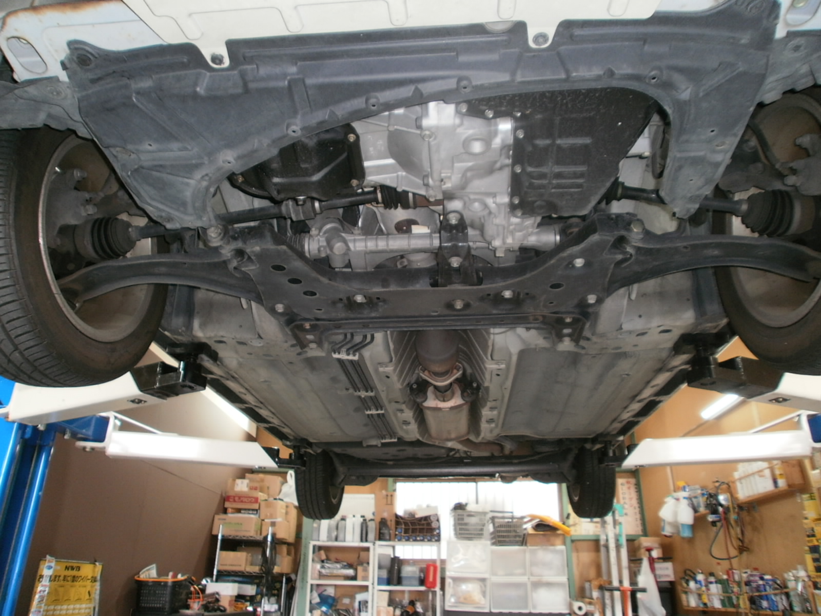 さて、点検開始~!当社、国家整備士によりリフトアップし、しっかりとお客様のお車を点検させていただきます。