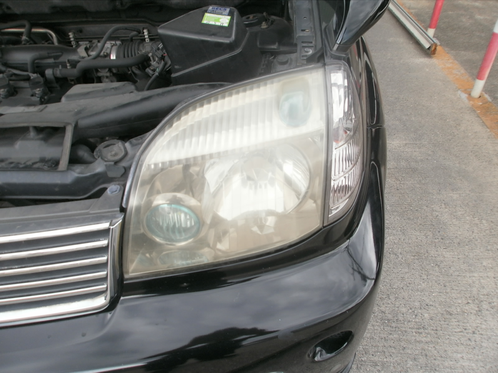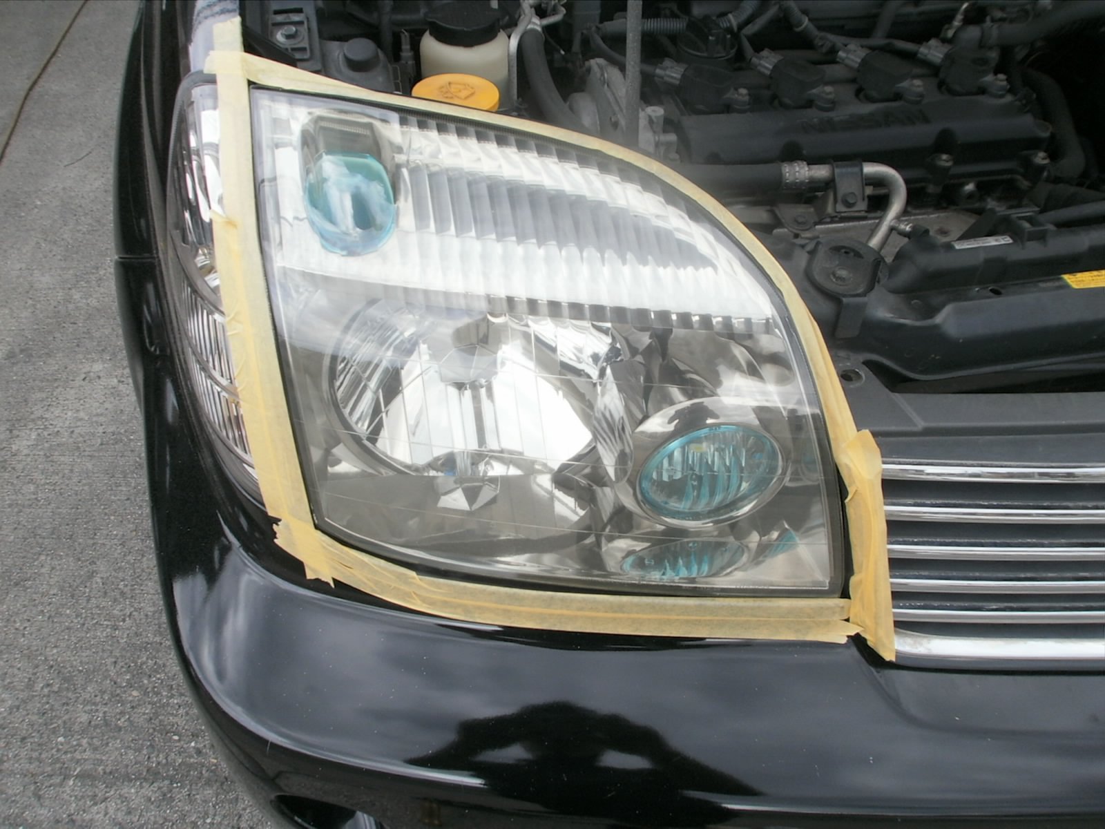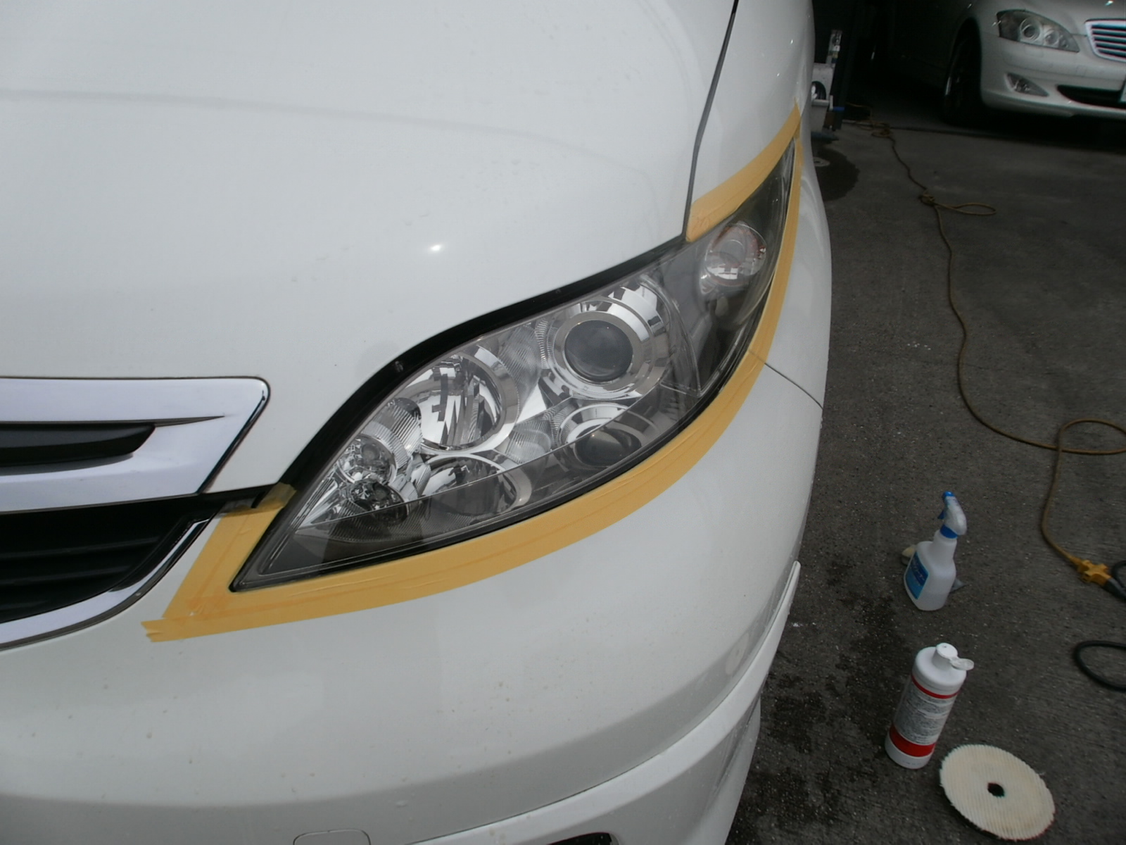 ご成約車輌のヘッドライトくすみ、黄ばみの除去。研磨作業です。