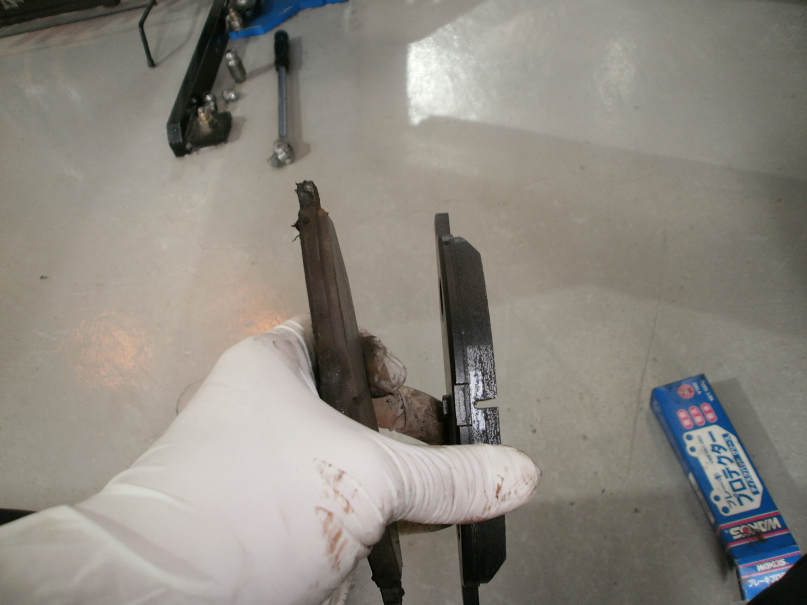 フロントブレーキパッド残量が減っておりましたので、交換です。交換してからすぐは、ブレーキの効き、踏み加減が若干変わってきますので、お気をつけくださいませ!