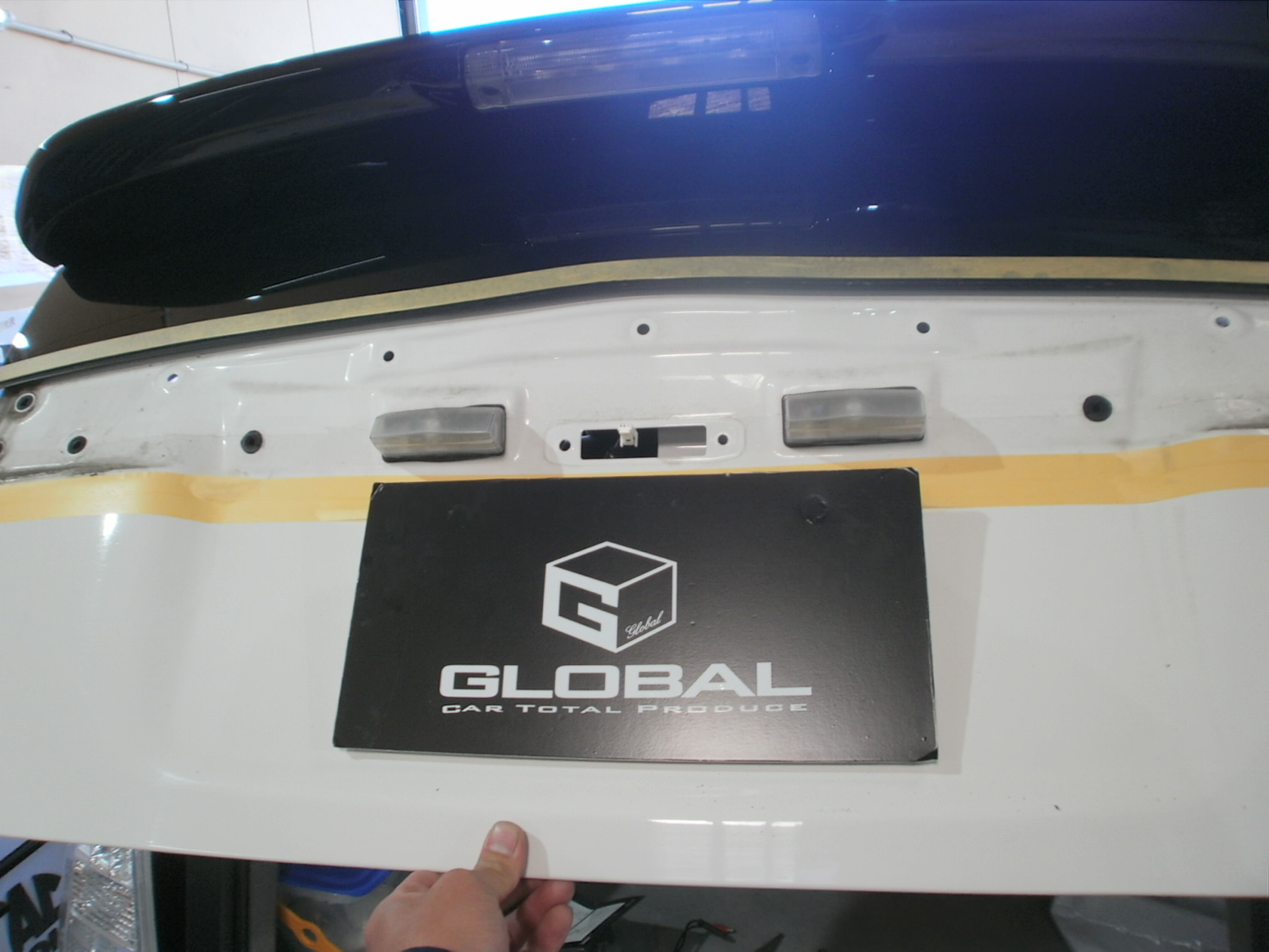 配線加工、リアゲートからミラーまで配線を通していきます。バックカメラも出来る限り目立たないよう、かつしっかりとモニターに映るよう確認していきます。