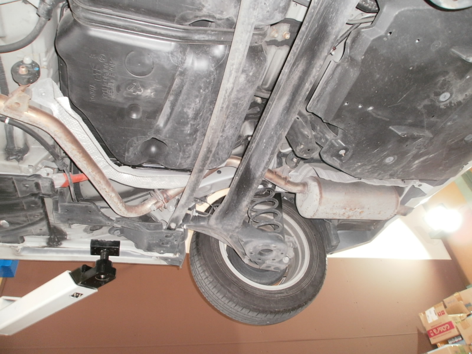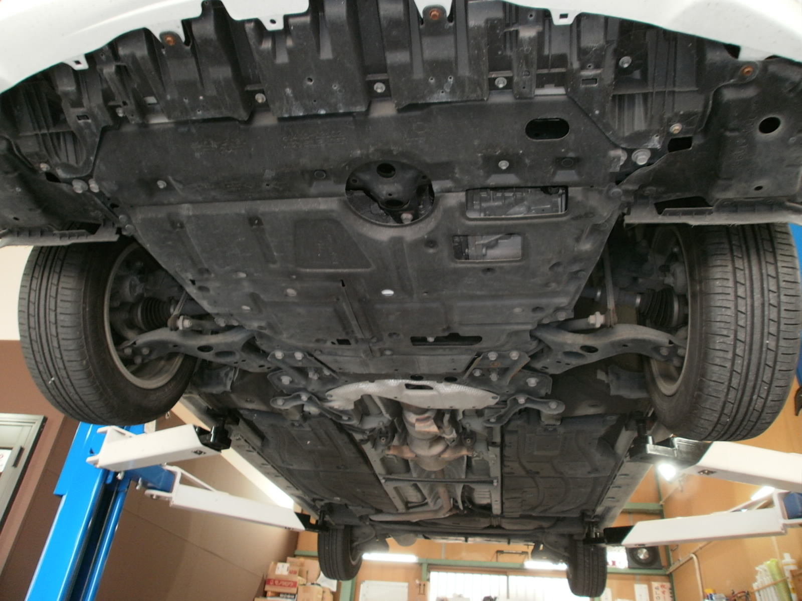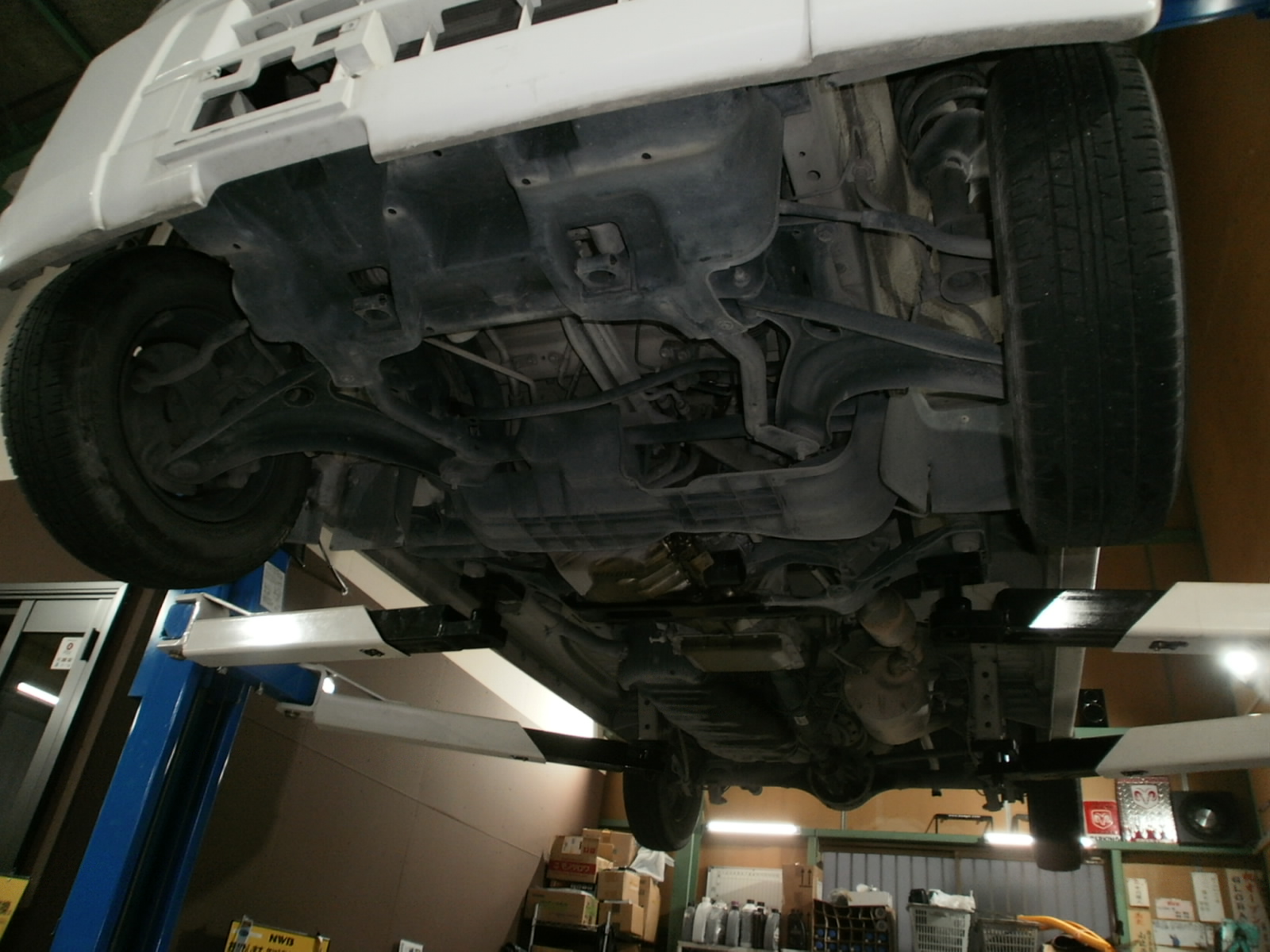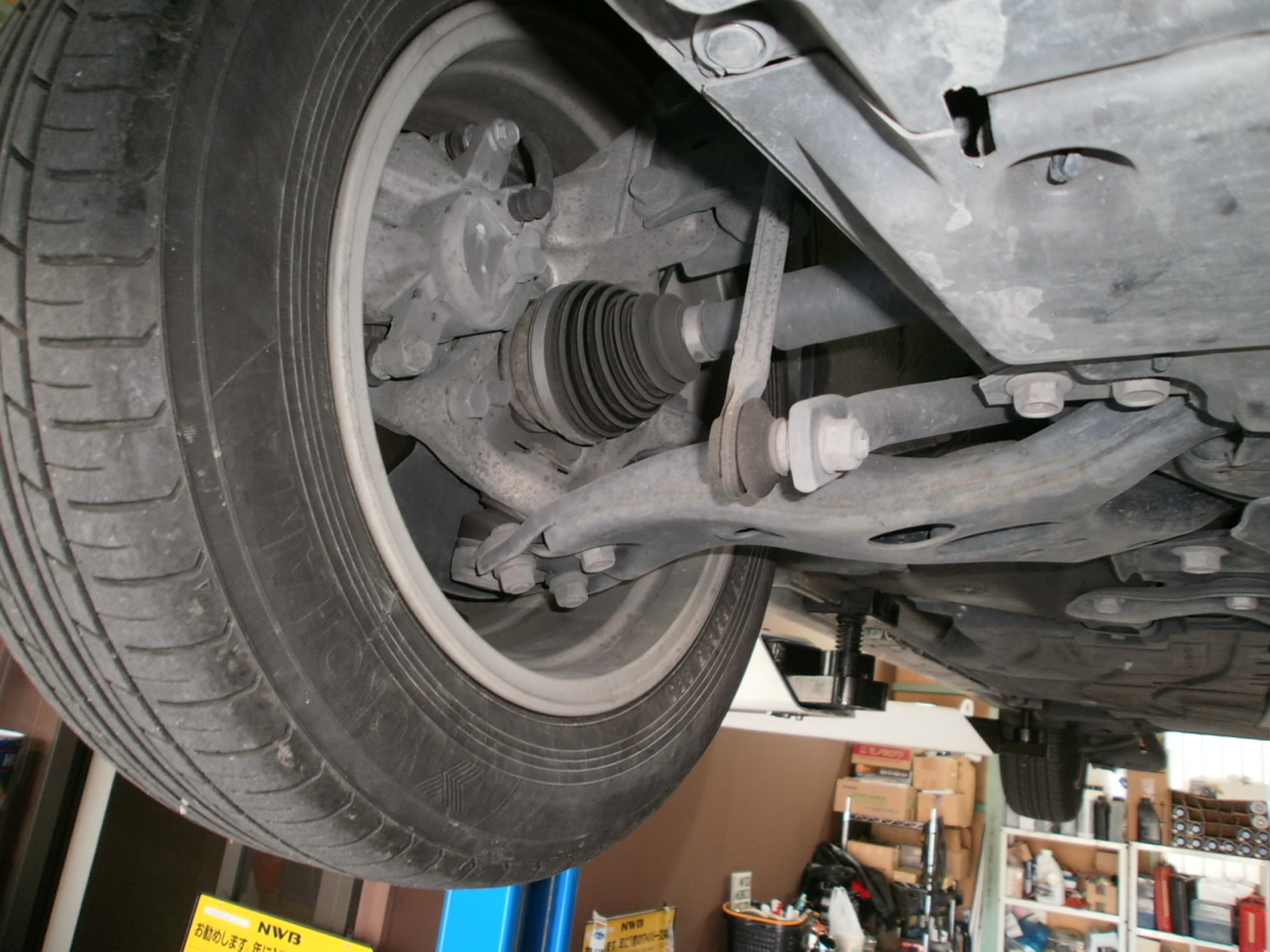 リフトアップし、各箇所点検していきます。ただいま点検診断中ですので、診断結果お見積併せご連絡を差し上げます。今しばらくお待ちくださいませ!