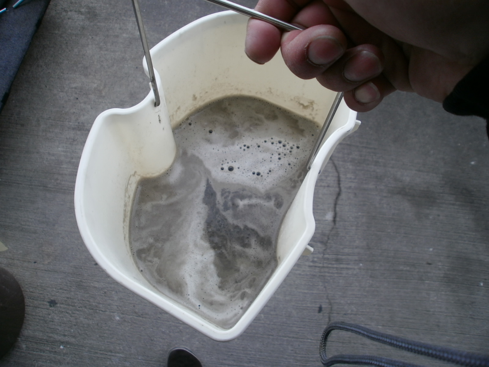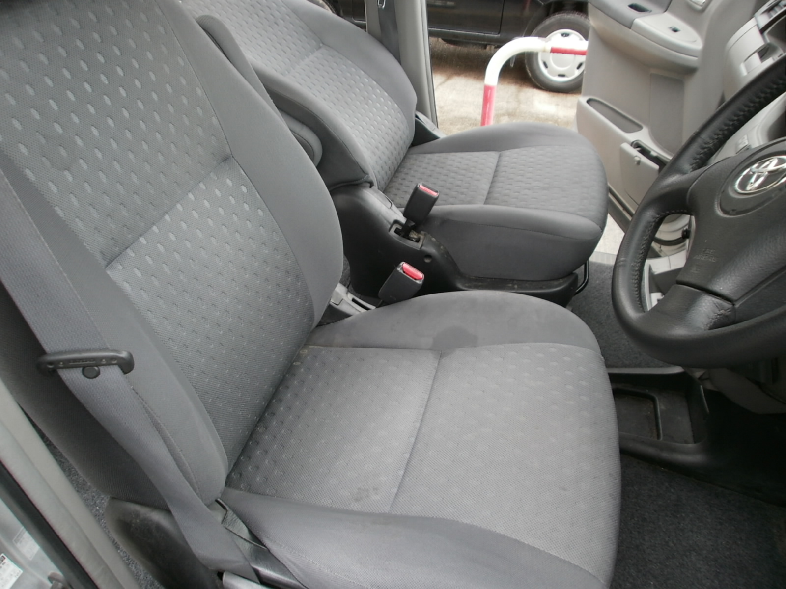 GLOBAL ルームクリーニングでのシートクリーニングの様子。特別な機械により、汚れをしぼり取ります。目立たないところでも汚れはたまってるんですよ~、右側の写真がシート一部を洗浄クリーナーした時の汚れ水。真っ黒です、、、