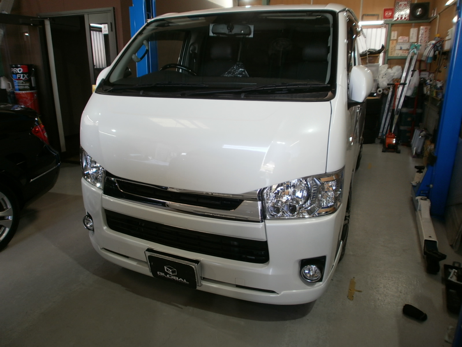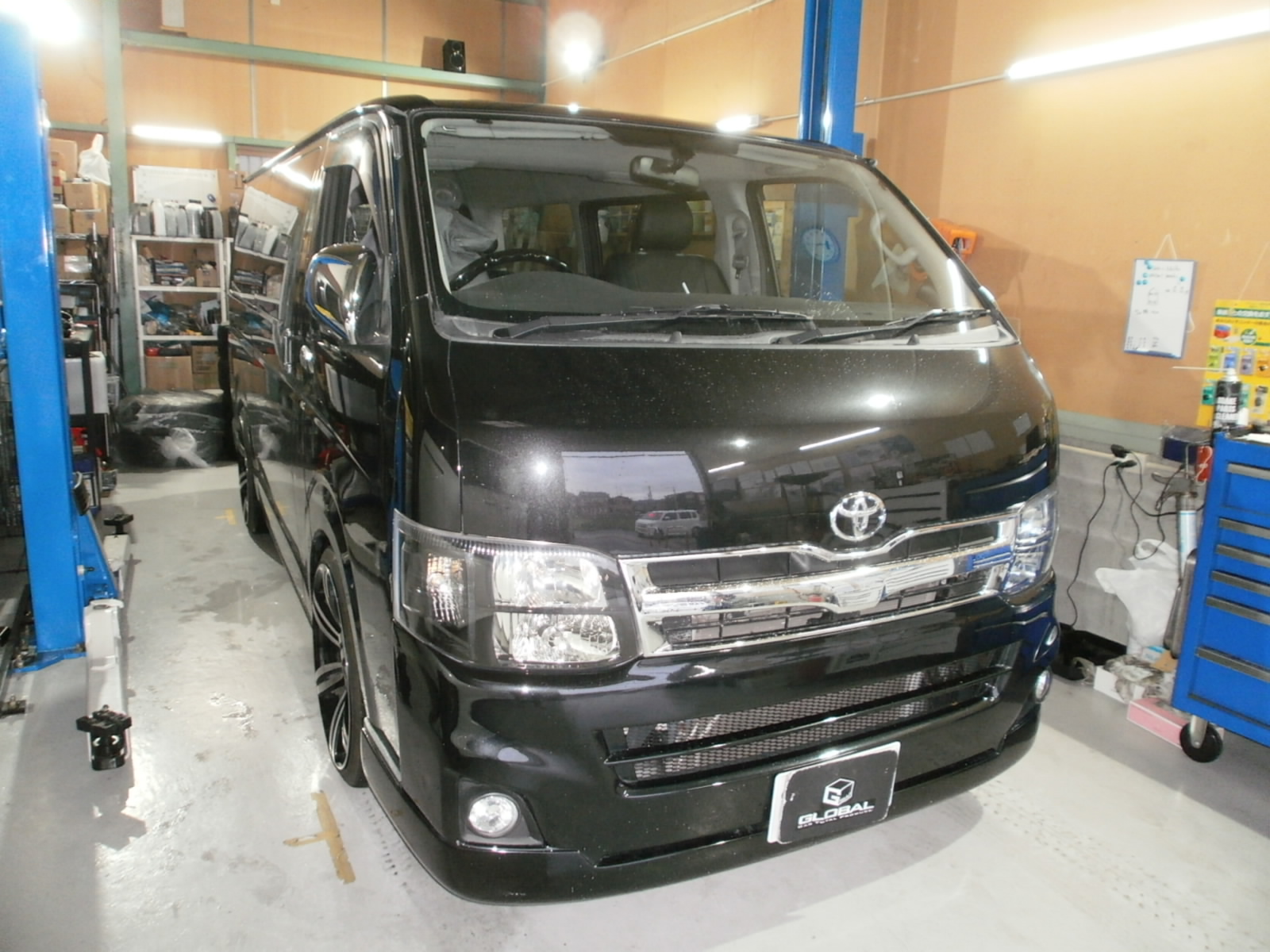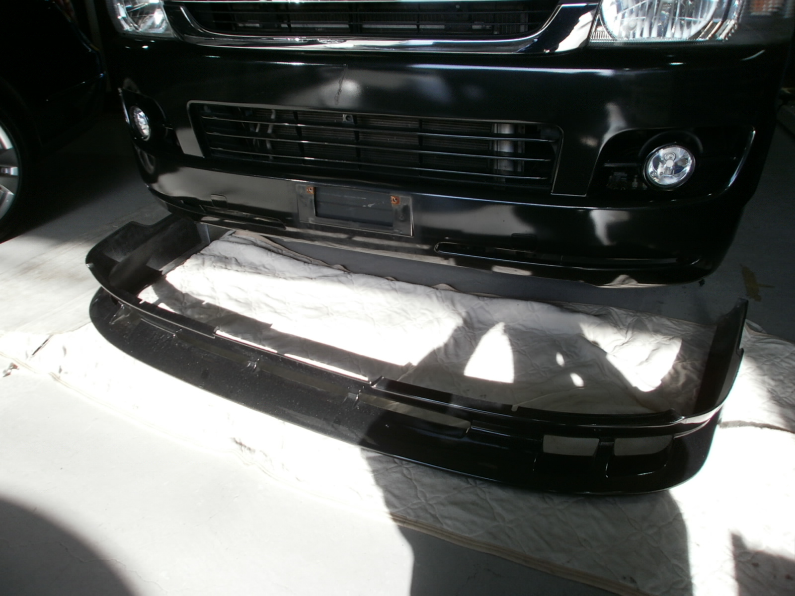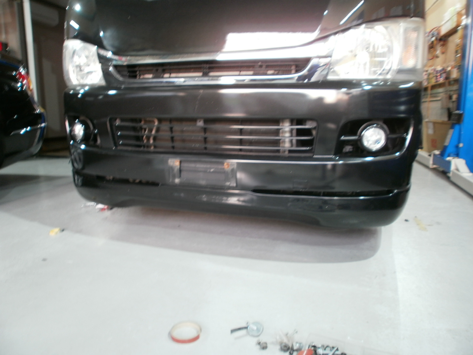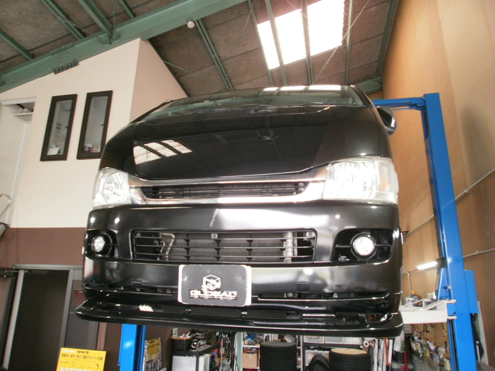 T様 ハイエース 足廻り強化カスタム・フロントハーフスポイラー交換です。
