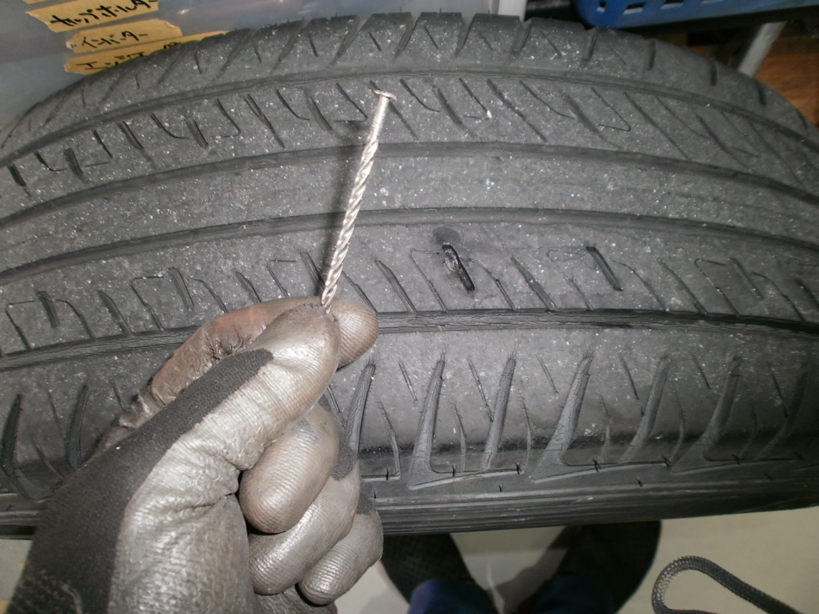 点検中、タイヤにネジの頭を発見。抜いていくとどうも長い。。。抜ききると約5センチほどのネジが。至急パンク修理をさせていただきました。早く気付いてよかったです!