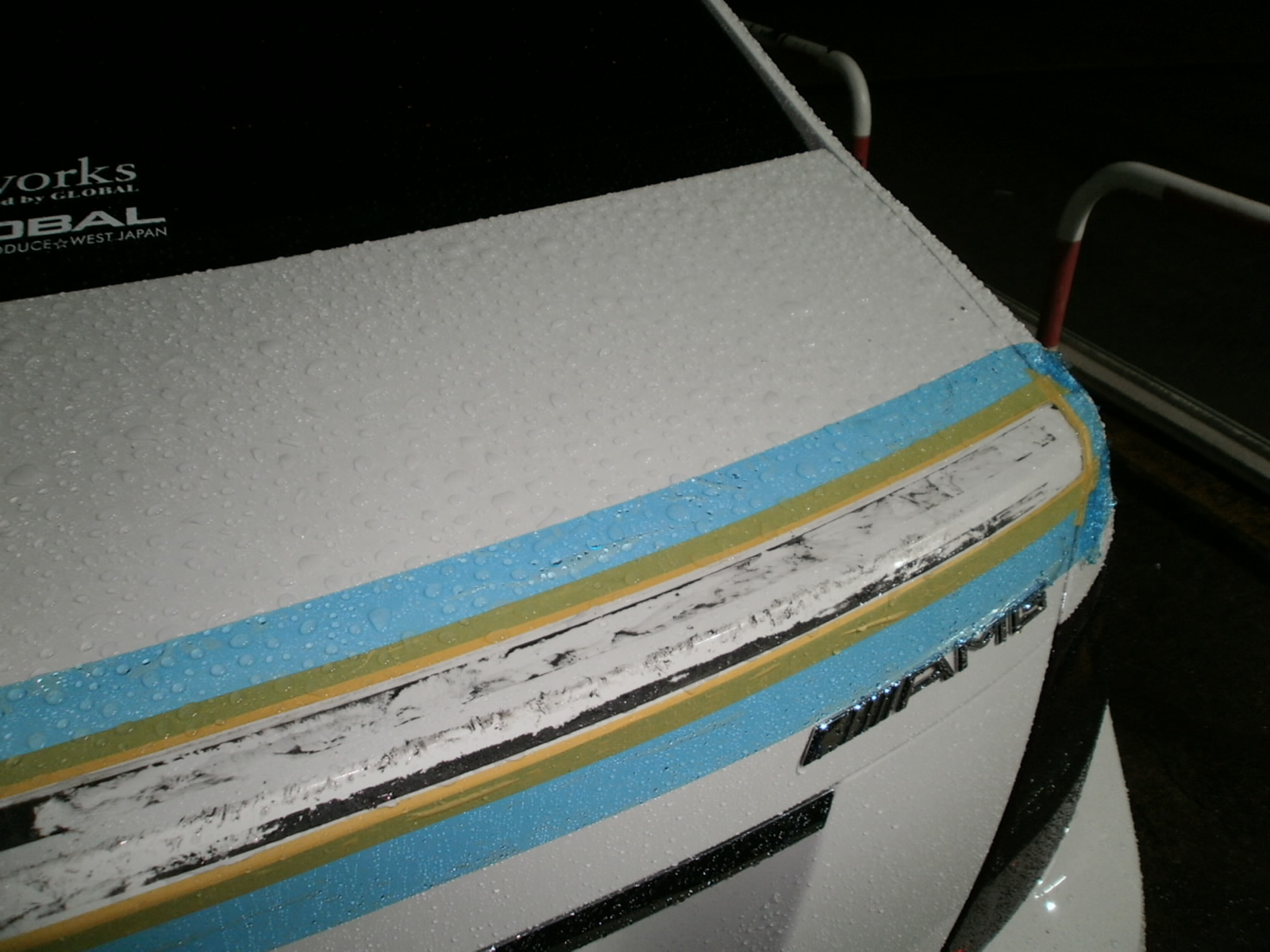 GLOBALカー C63 リアスポイラー取り外し~、外れたものの両面テープの残骸が、、、コツコツ頑張りますか。(笑)