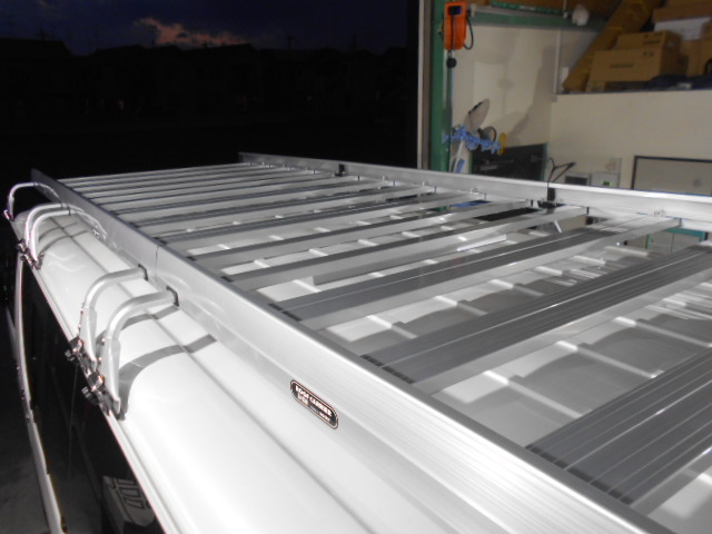 取付後です。ハイエースに取り付けるとフロントからリアまでぴったりでした!お使いによって高さも調整できるのですごく便利ですね!お仕事などにも長い荷物などにも役だってくれそうですね~