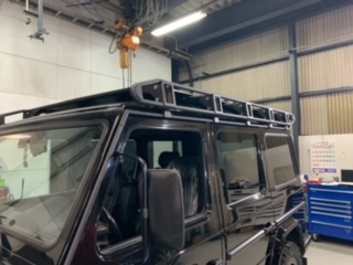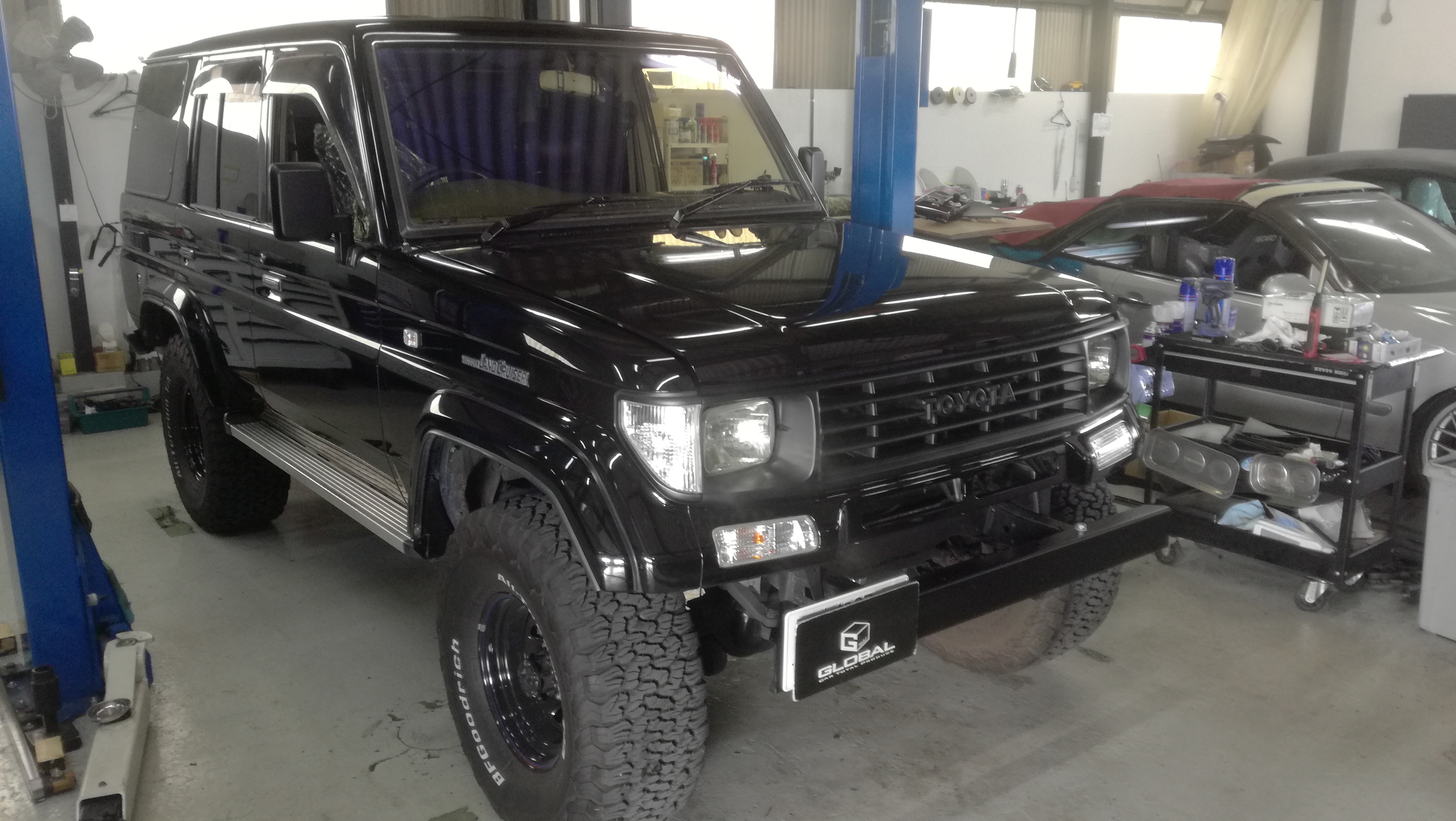 プロフェッショナルミラー、ブリンカー類オレンジ化、フロントグリル交換、FRバンパー・グリル・ヘッドライトカバーガード等の艶消しブラック塗装、アルミサイドステップ、タイヤホイールセット、ルーフキャリア・ラダー、背面タイヤカバー、ガラスコーティング施工などなど。