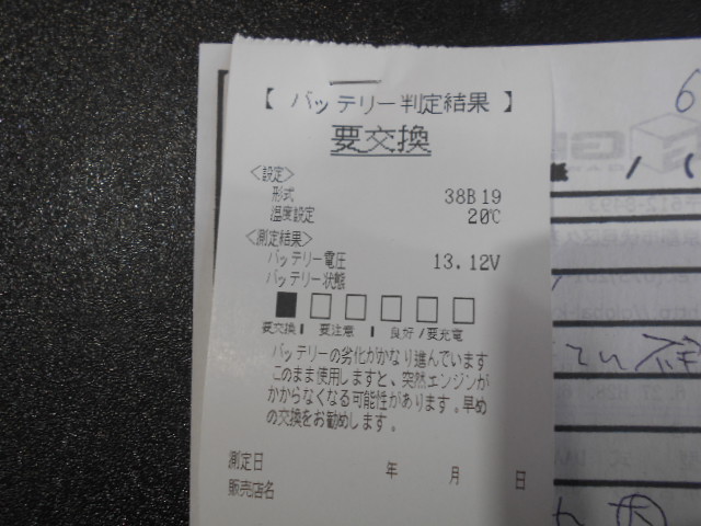 その他、消耗部品数点のほか、バッテリー出力点検では20%となっておりましたので、交換させていただきました。これからの季節は、特にバッテリー上がりのトラブルも多くなります、点検し出力低下しておりますと交換をオススメいたします。点検だけでもお気軽にお申し付けくださいませ。 N様 ご入庫ありがとうございました。