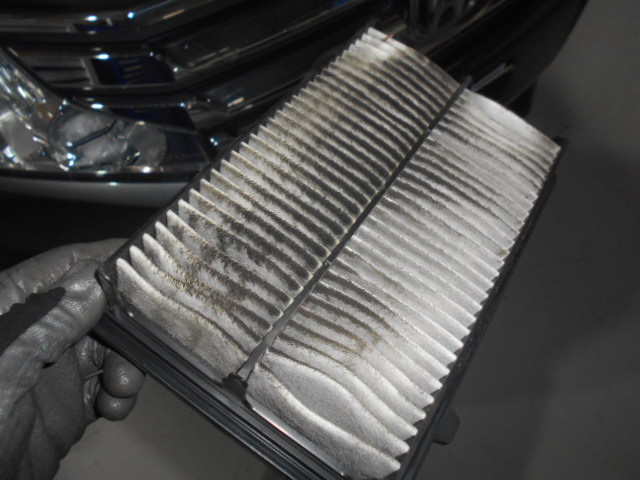 エアーエレメント・エアコンフィルター交換。はっきりと汚れがわかります。