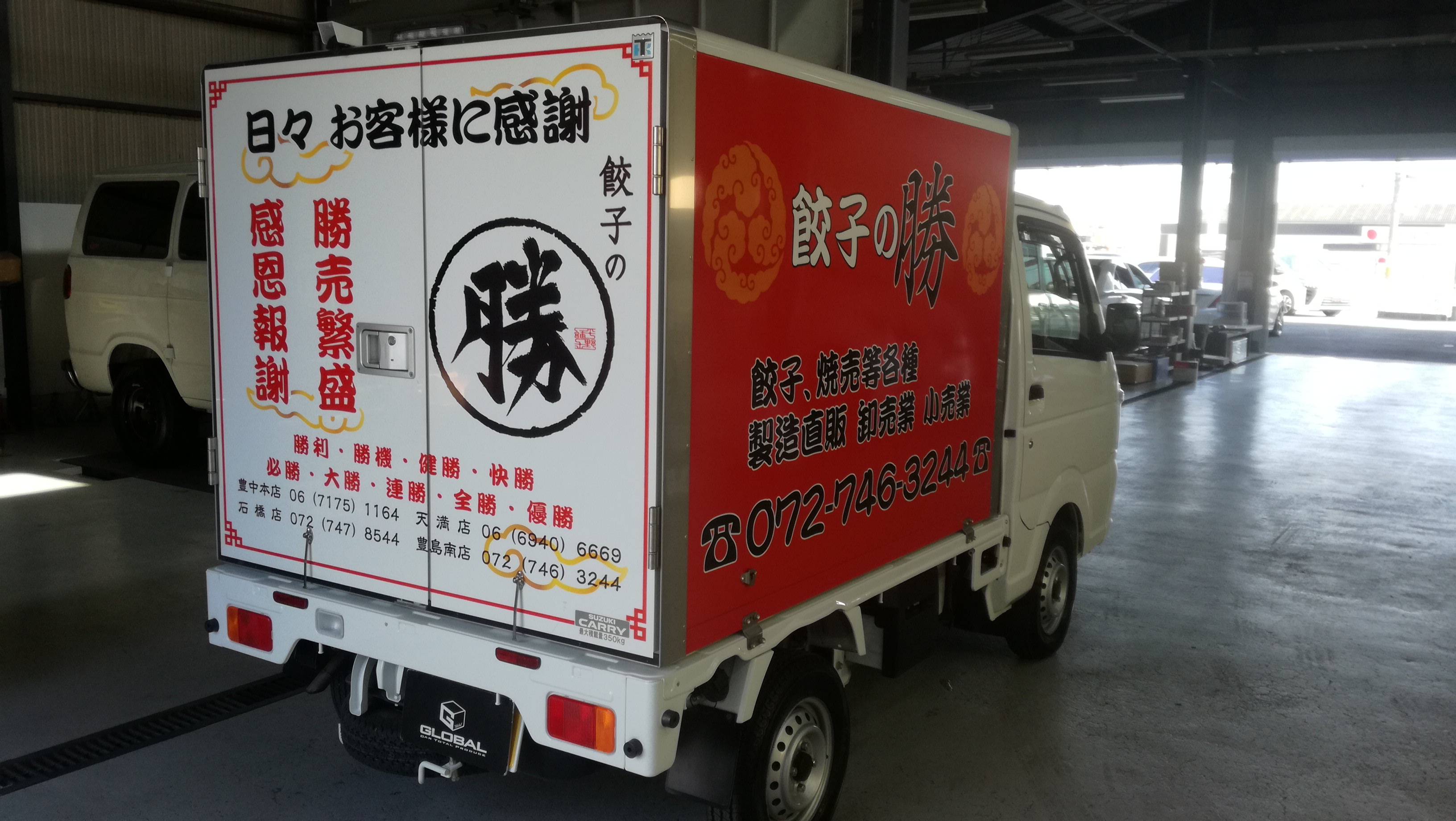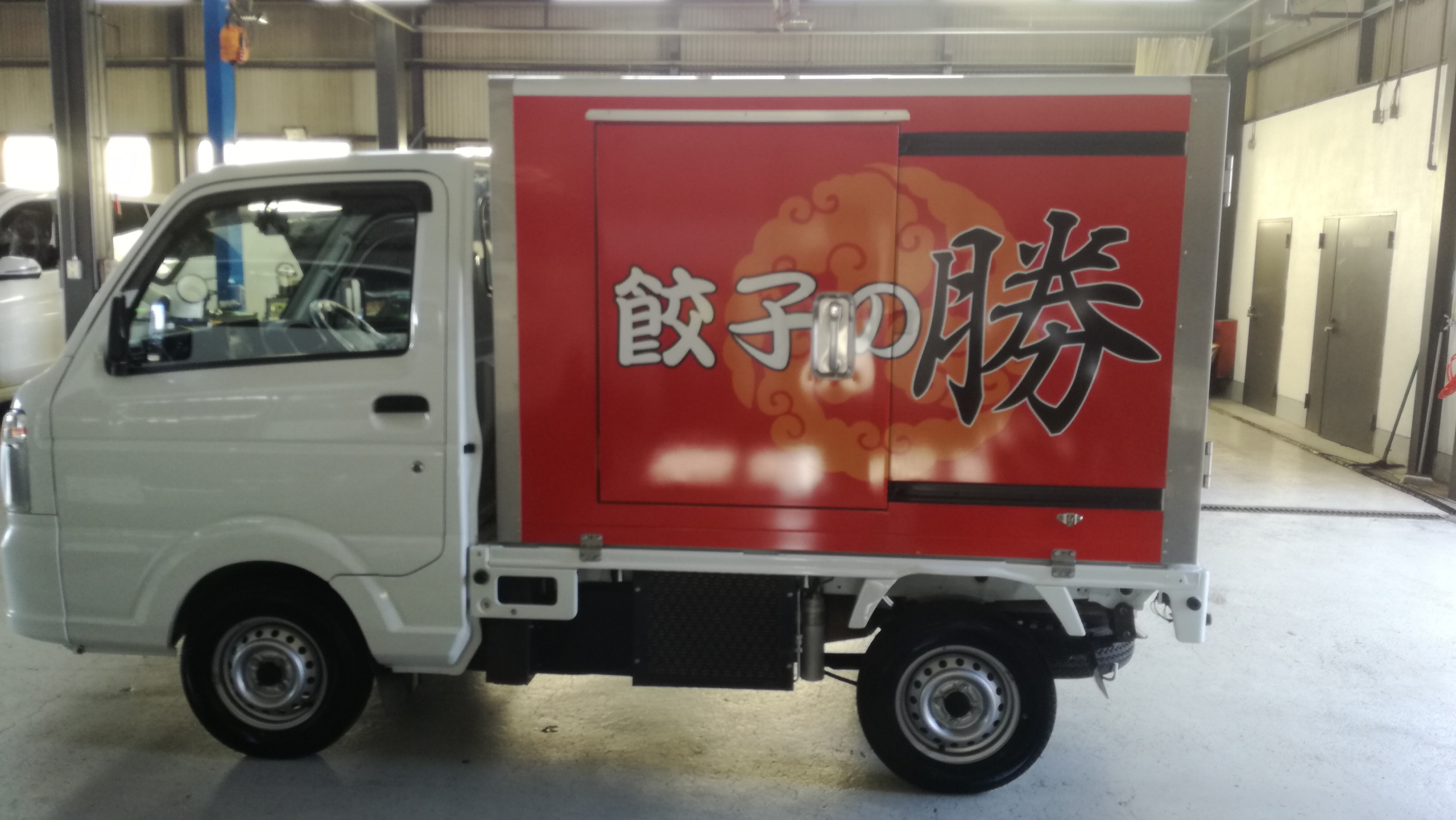 今回、ご依頼いただき荷台の3面にお店(餃子の勝)の看板を!カッティングシートでもなく、直接車両に特殊プリントしております!かなりいい仕上がりになりましたっ(#^^#)