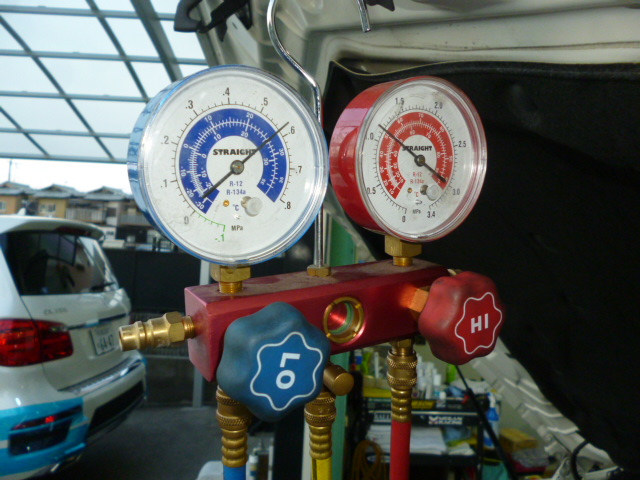 エアコンが効かないとの事でガス圧などの点検実施。今しばらくお待ちくださいませ!