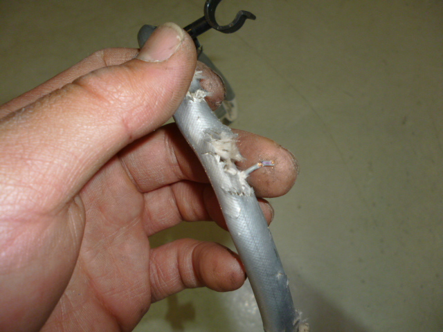バキュームポンプの配線が、、、断線。よく見ると何かにかじられたあと。ネズミか猫でしょうか。