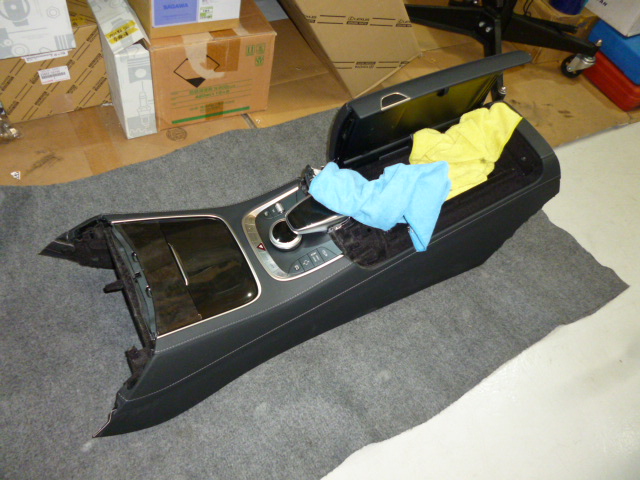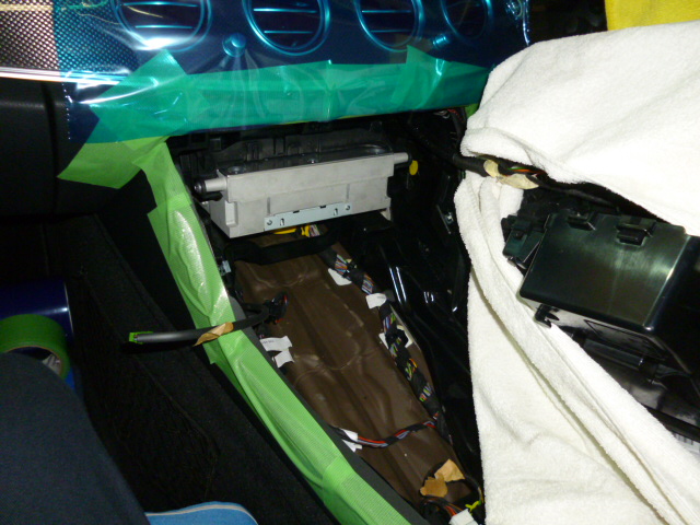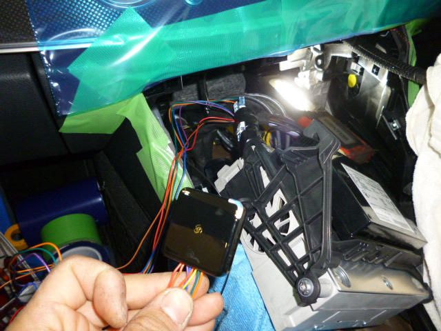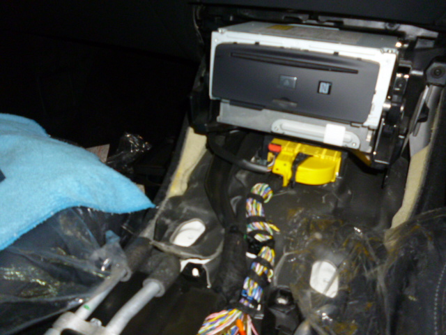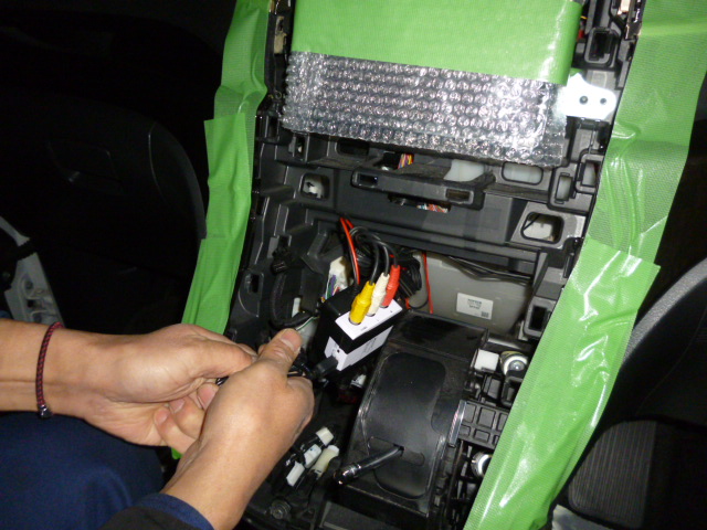 そして、TVキャンセラーの取付です。センターコンソールパネルをばらしていき、ユニット裏で配線加工、オンオフ切り替えスイッチの配線をとりまわして助手席足元に取付です。