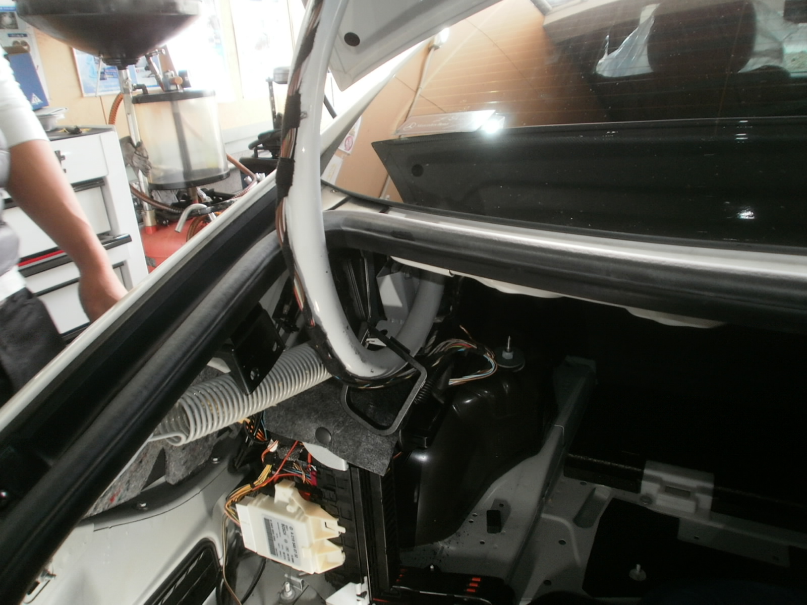 Y様 CLSクラス リアナンバー灯点かず・パワートランク開かずとの症状で点検修理のご入庫です。