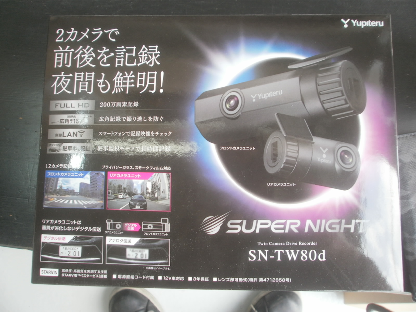 今回、ユピテルのフロント・リアカメラセットの商品をご用意、取付させていただきます。また、このモデルは本体で映像は見れませんが、専用のアプリにてスマートフォンより映像が見る事ができます。