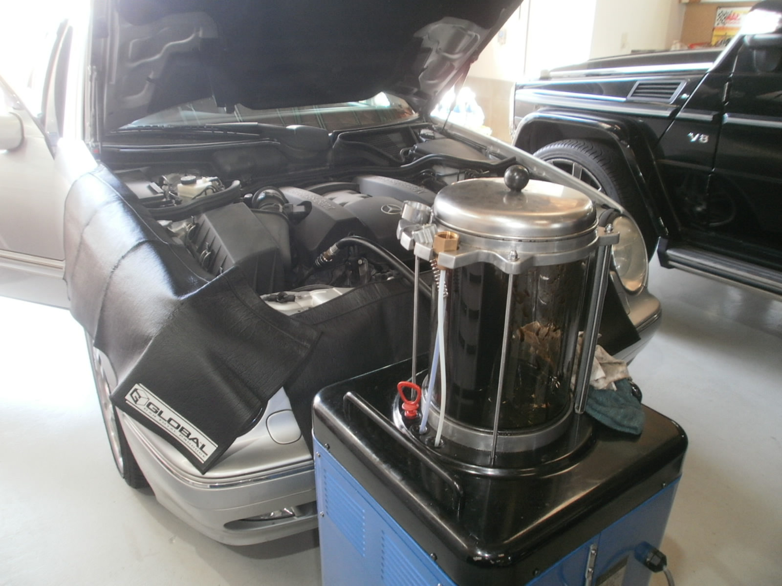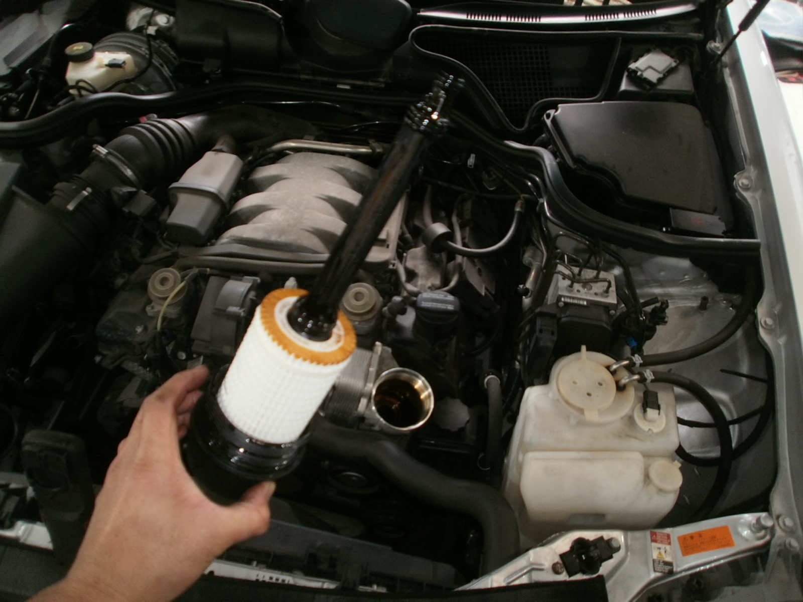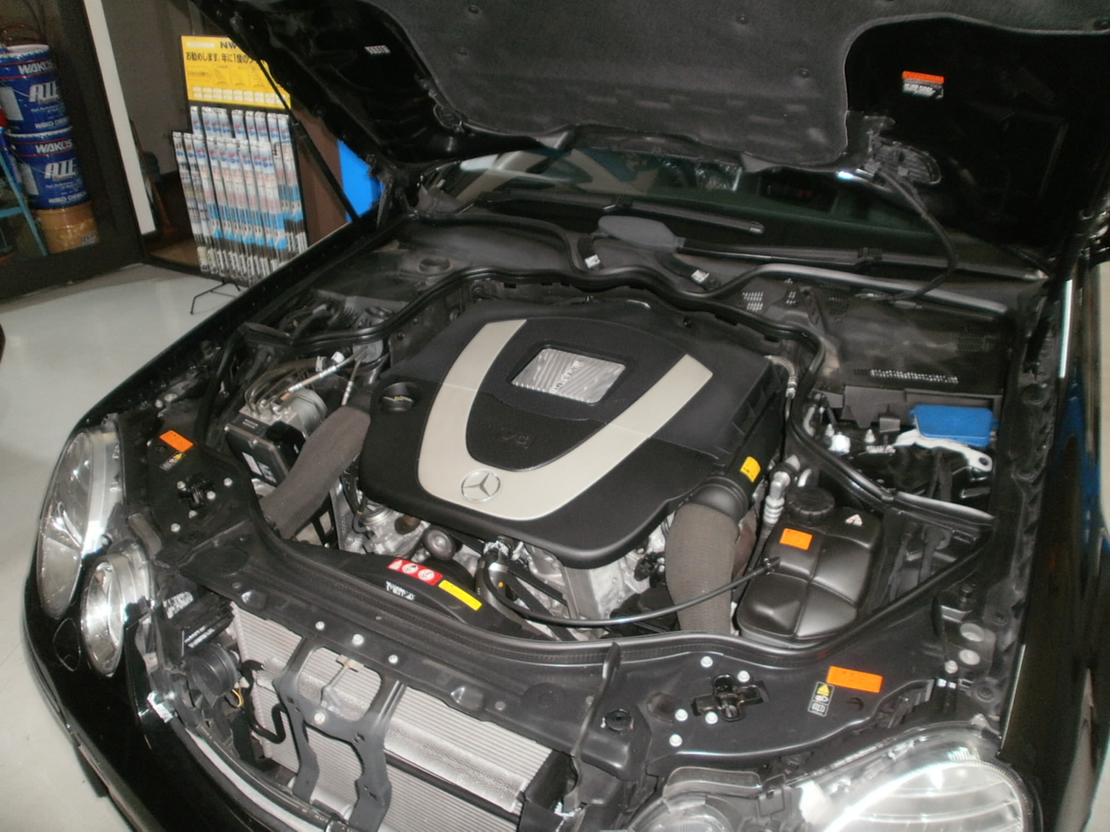 I様 W211 エンジンオイル・オイルフィルター交換、ヘッドライトバルブ点検です。