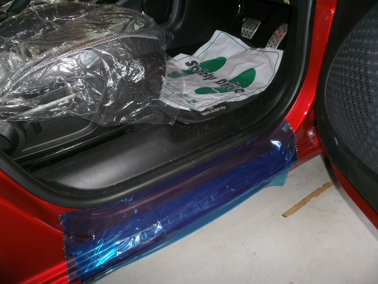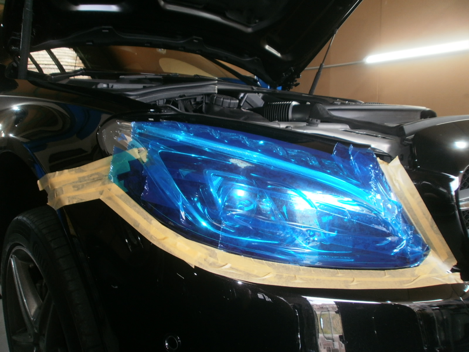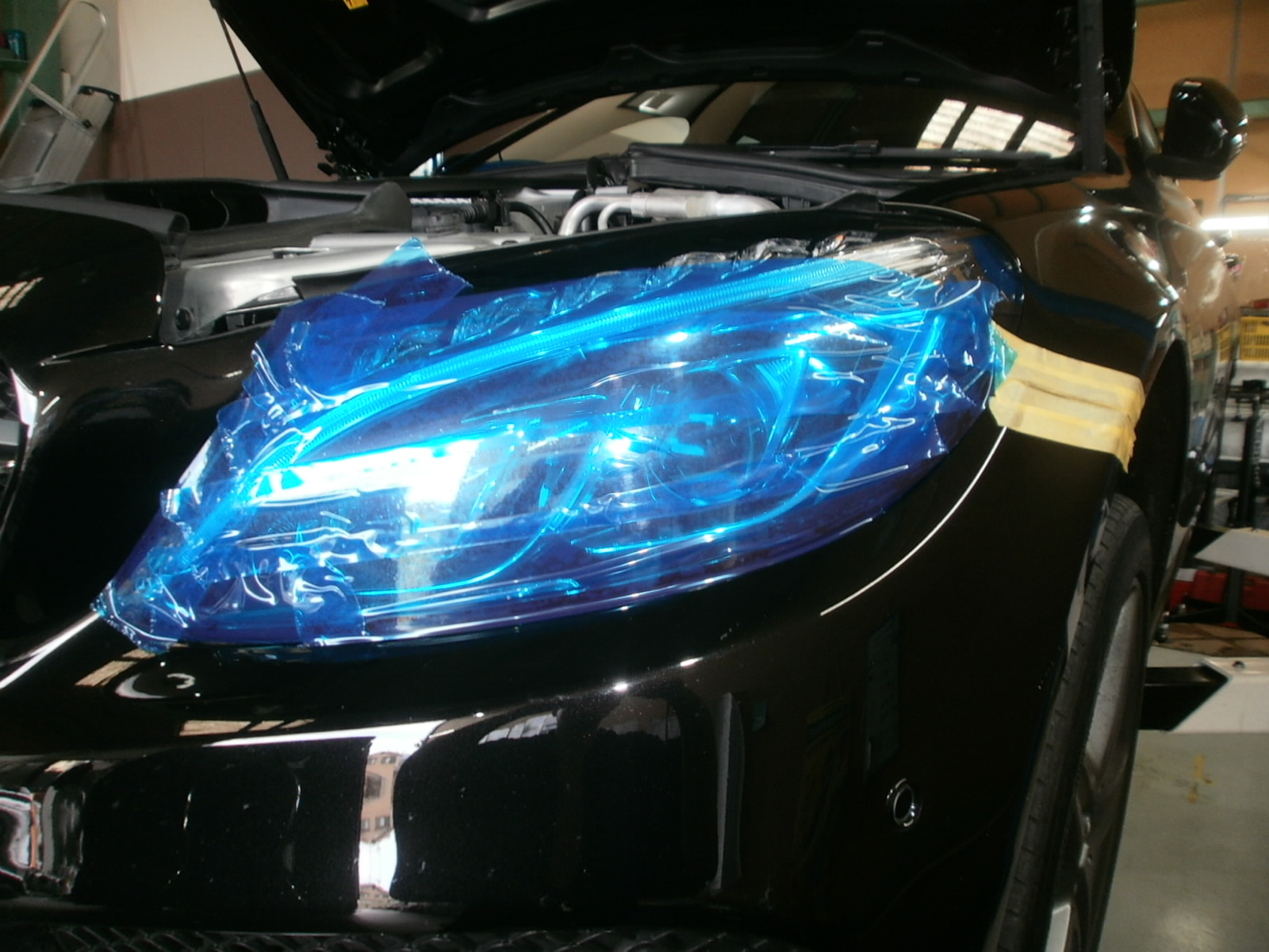 まずは、フロントバンパーを外すため、ヘッドライト、フェンダーを養生していきます。
