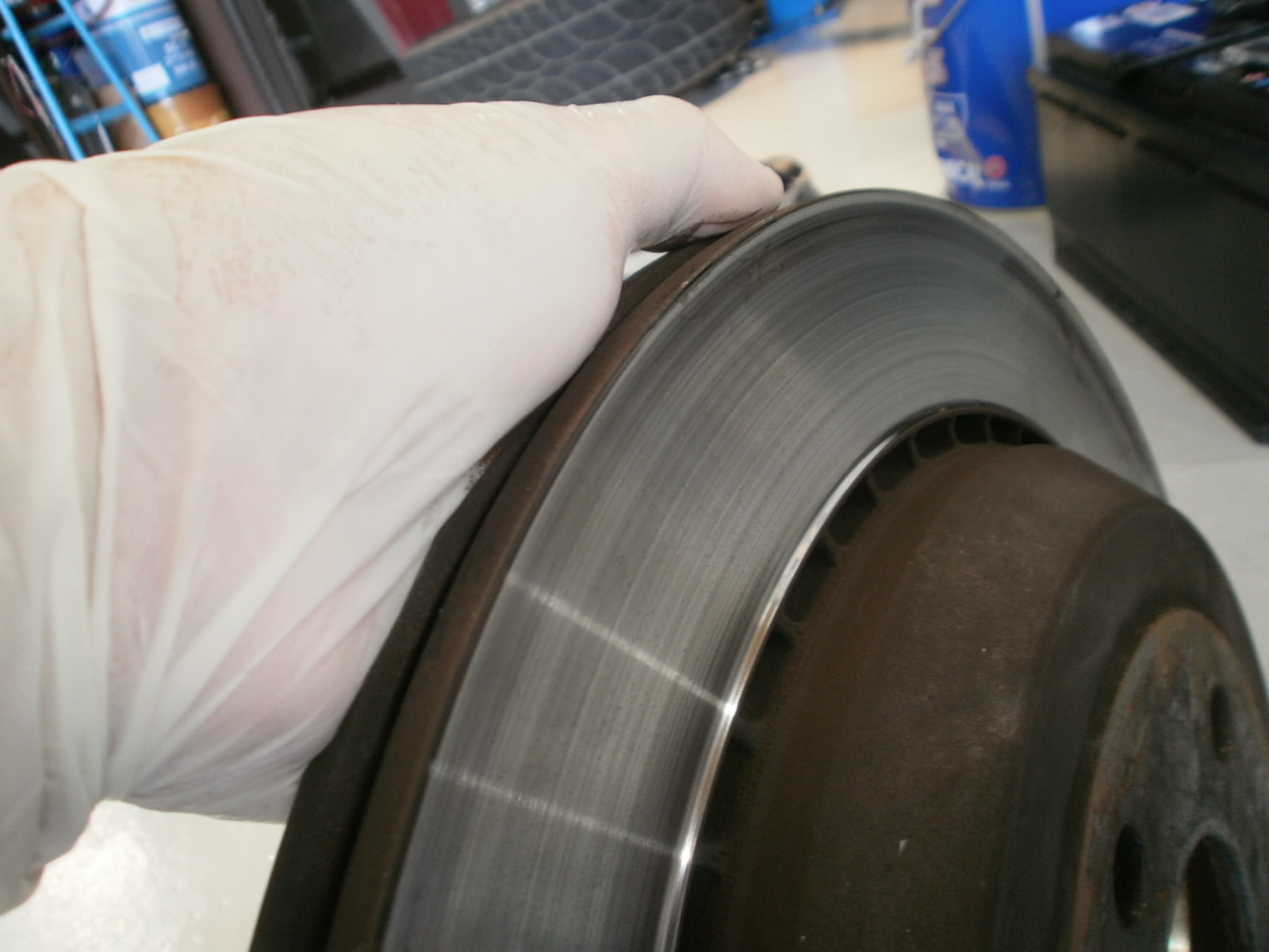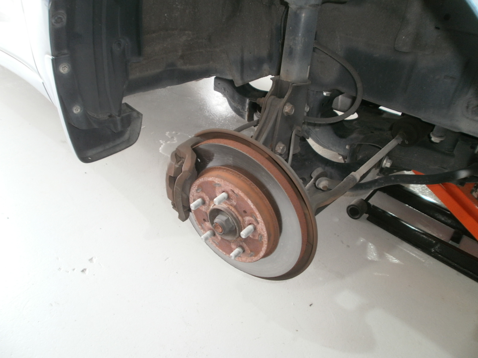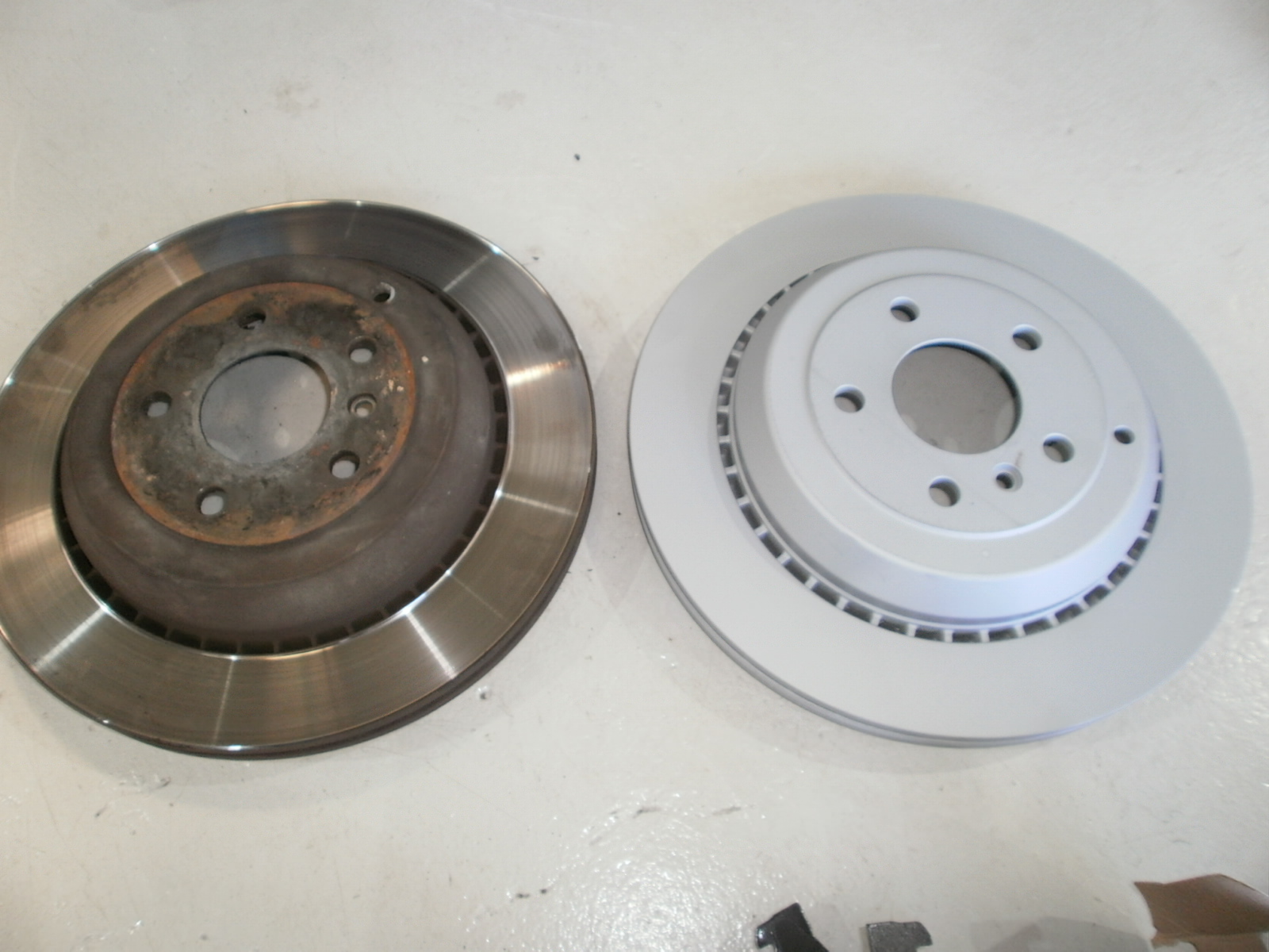 リア、ブレーキローター・ブレーキパッド・センサーの交換です。パッド・ローター残量もこの通り。ローター新品だと気持ちいいですよね~!
