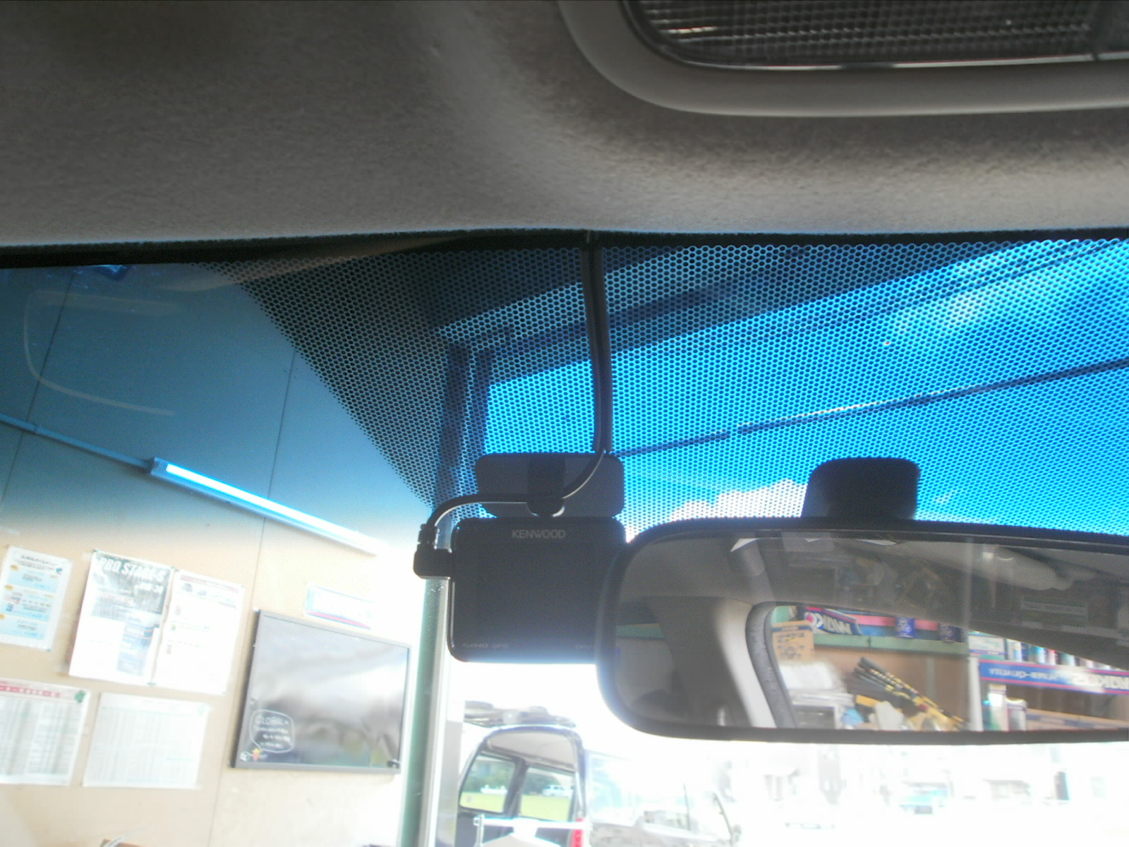 今回は、KENWOODのドライブレコーダーを取付させていただきました。運転の視界の邪魔にならないように、ミラーの裏あたりに取付。