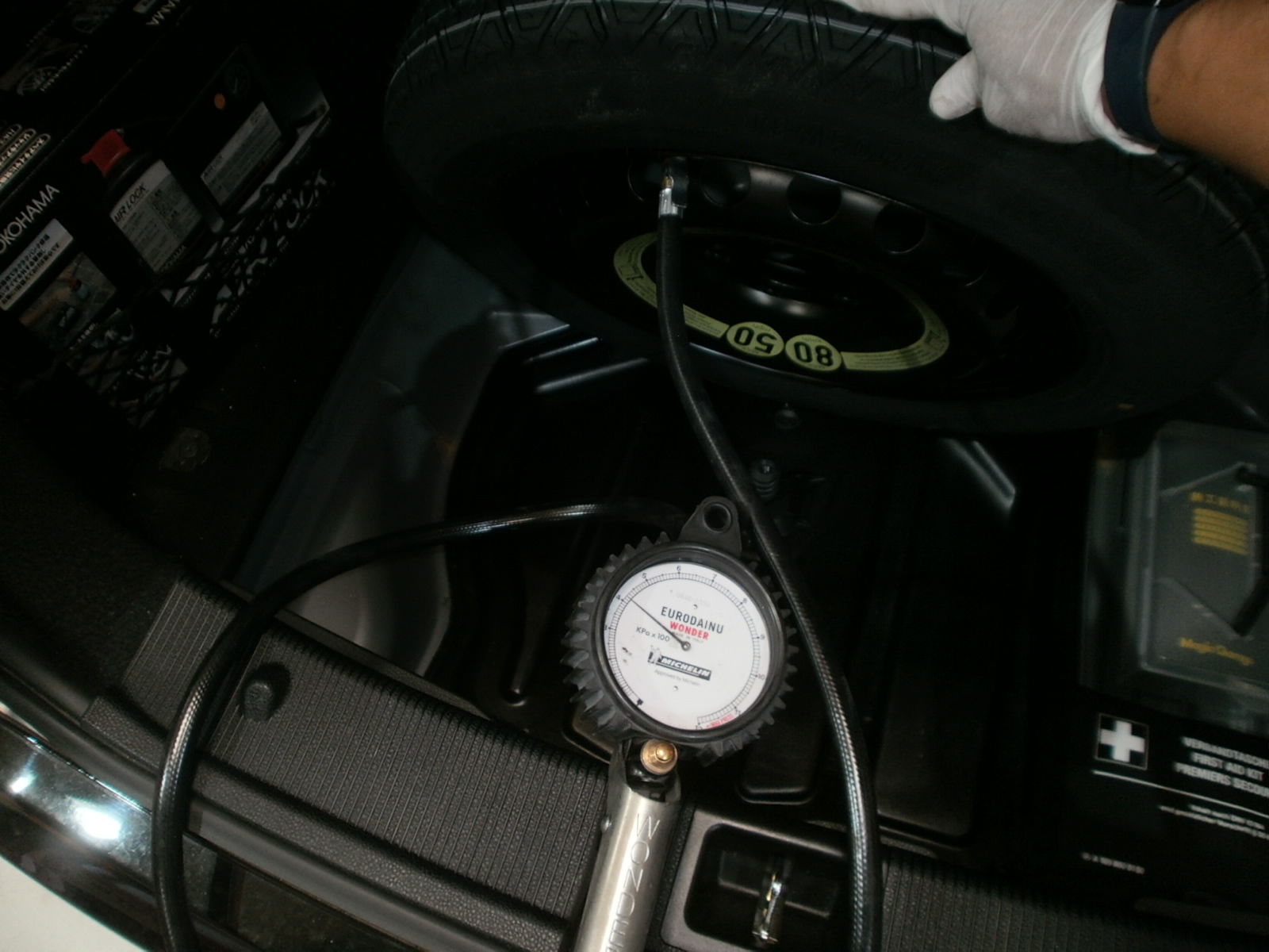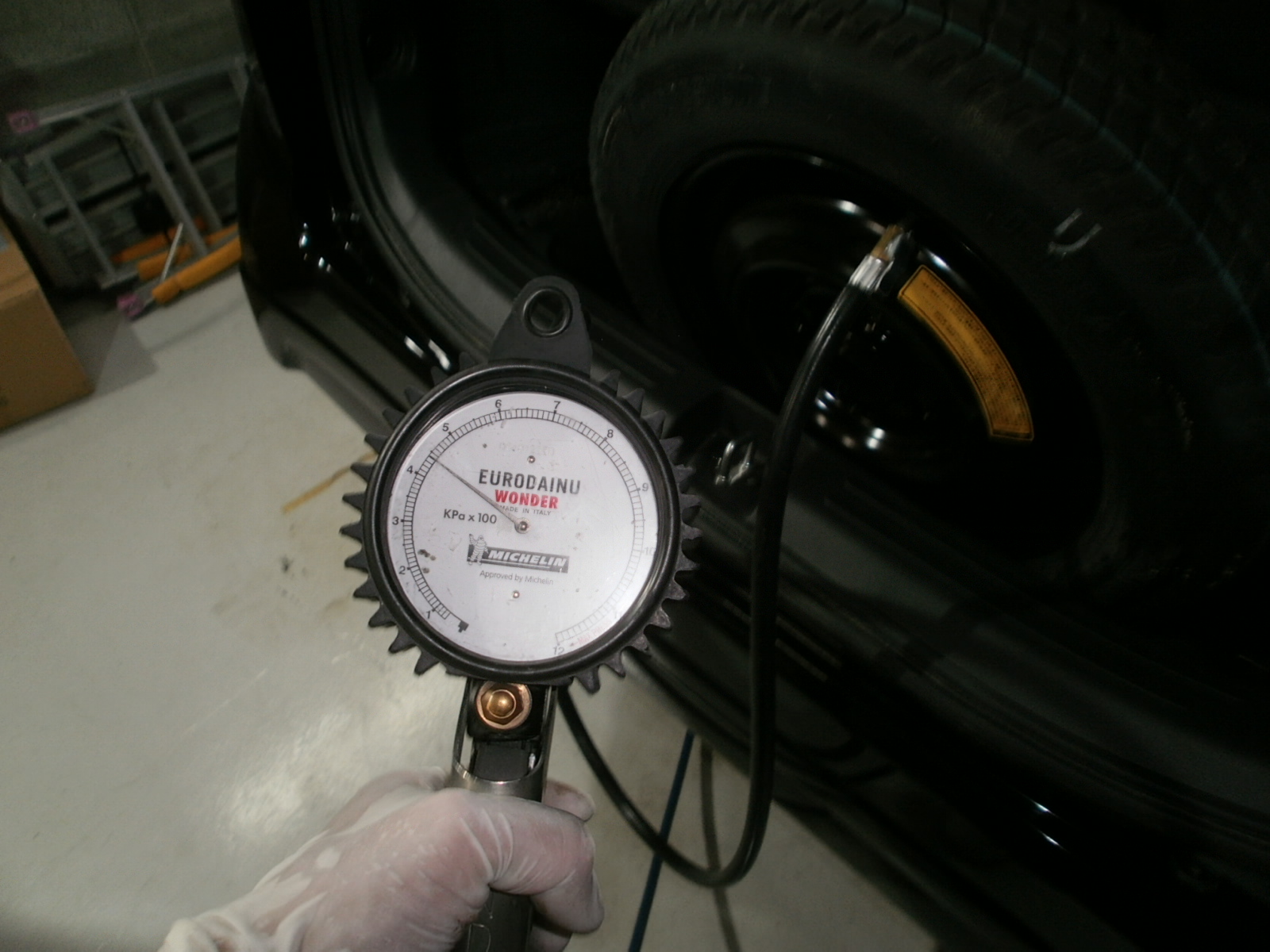 車検バリューパック施工、スペアタイヤの空気圧調整も。いざというときにパンクしているというケースも多々あるようですよ。