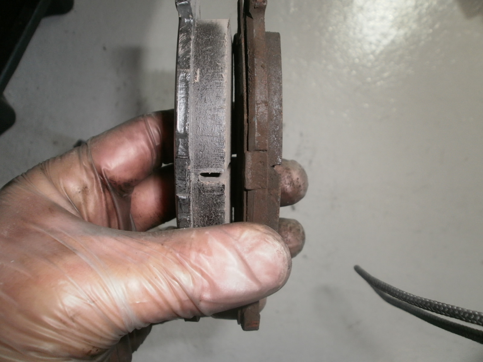 少し見にくいですが、左が新品・右が旧品、パッド残量の違いはこの通りです。これだけの厚さが違うと、交換時ブレーキのふみしろが少し変わってきますので、運転にはご注意くださいませ(^^♪