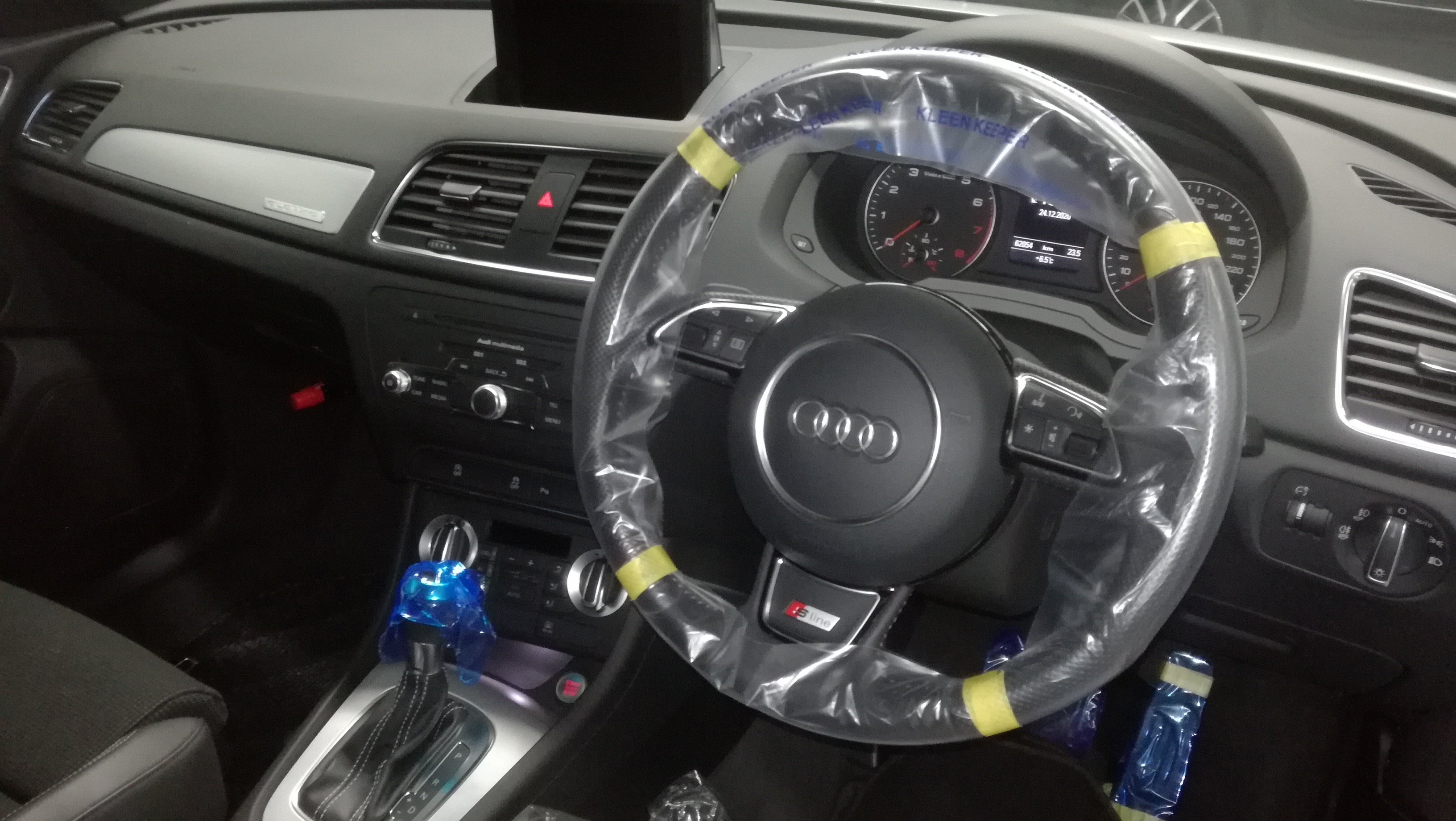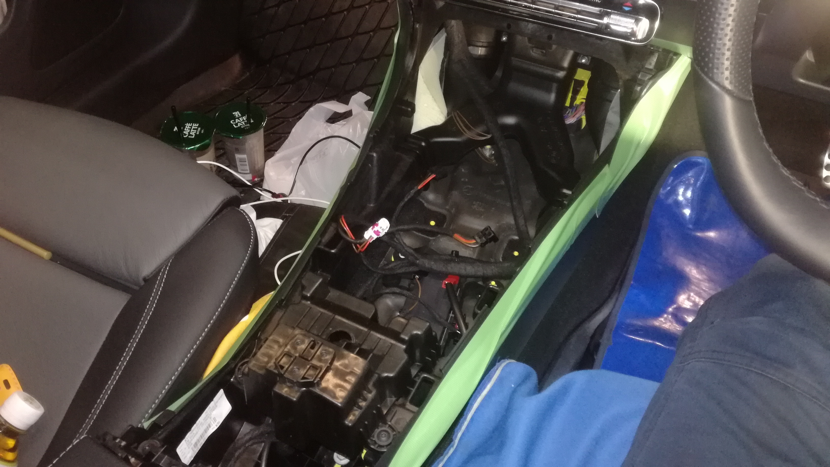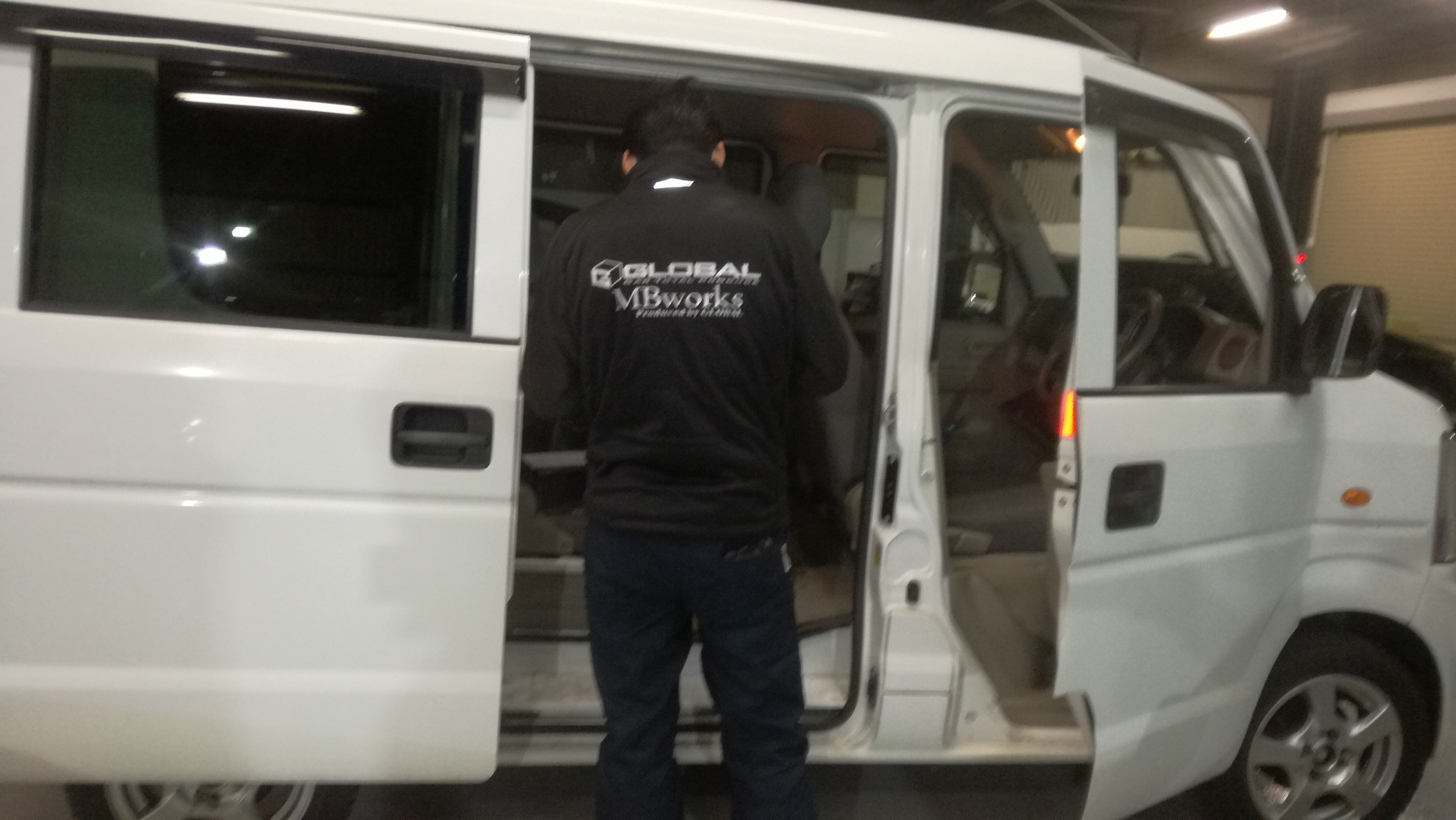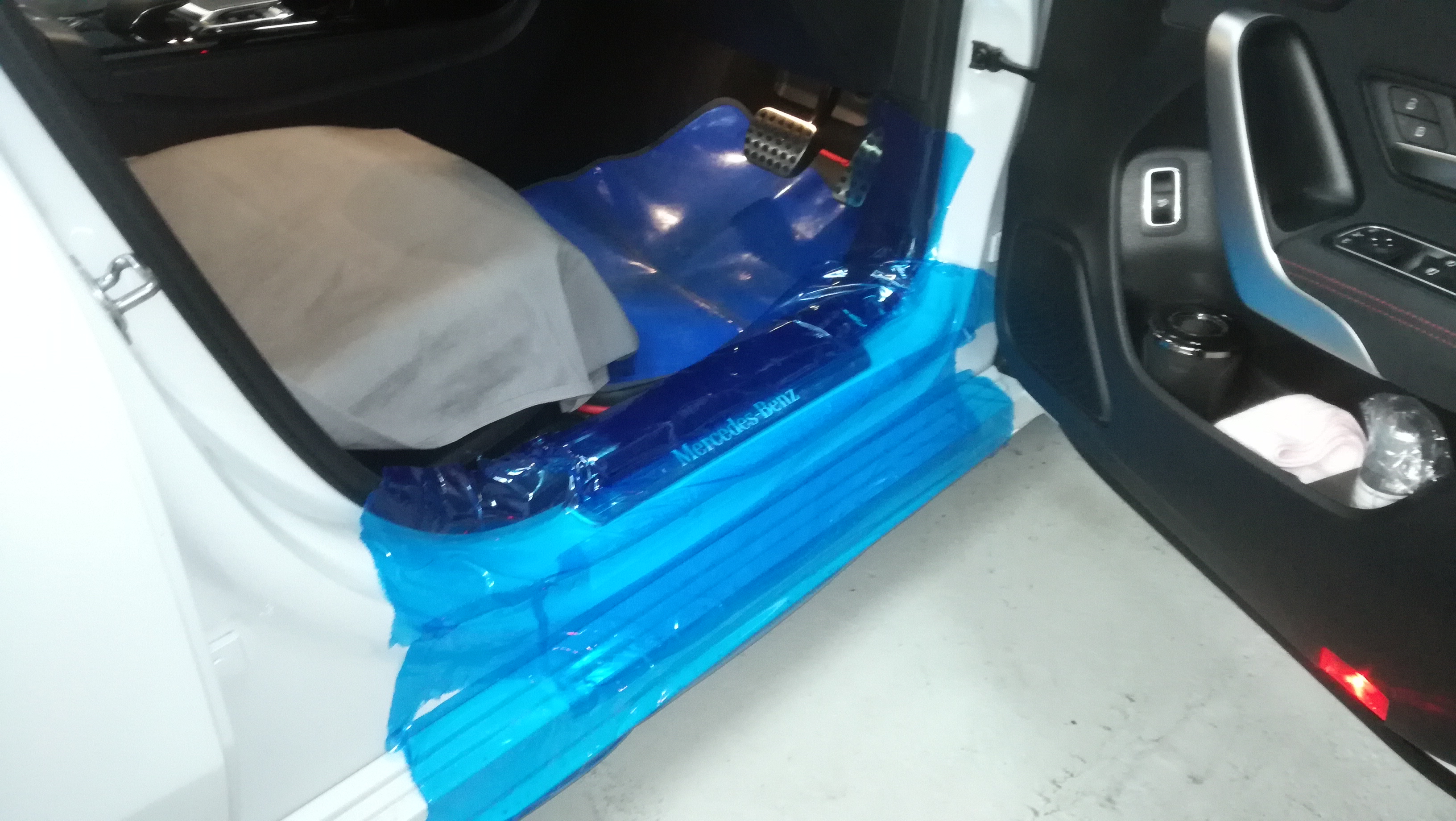 作業にあたり養生からスタート、右フロントシート下での作業が必要になるのでシートの脱着
