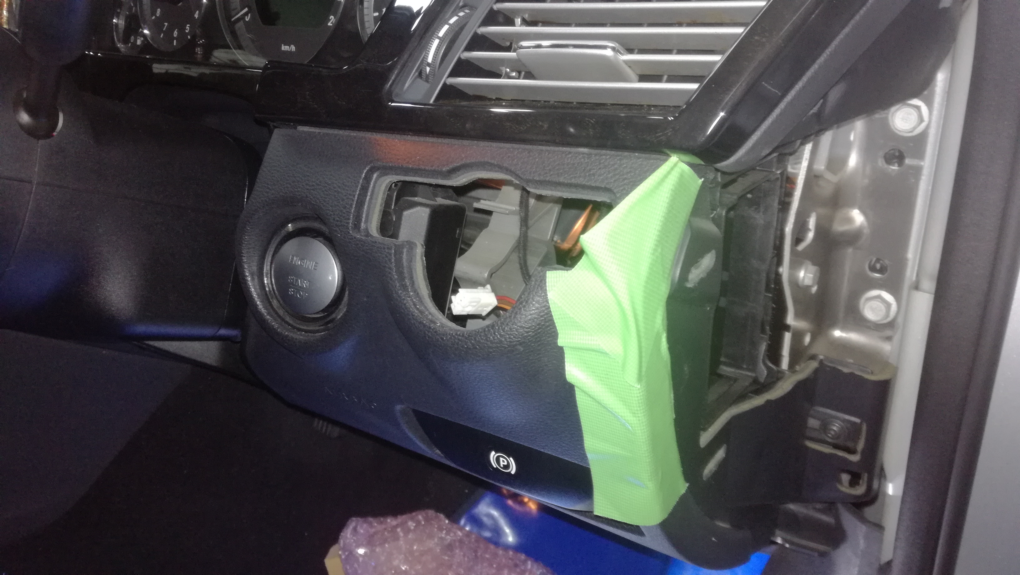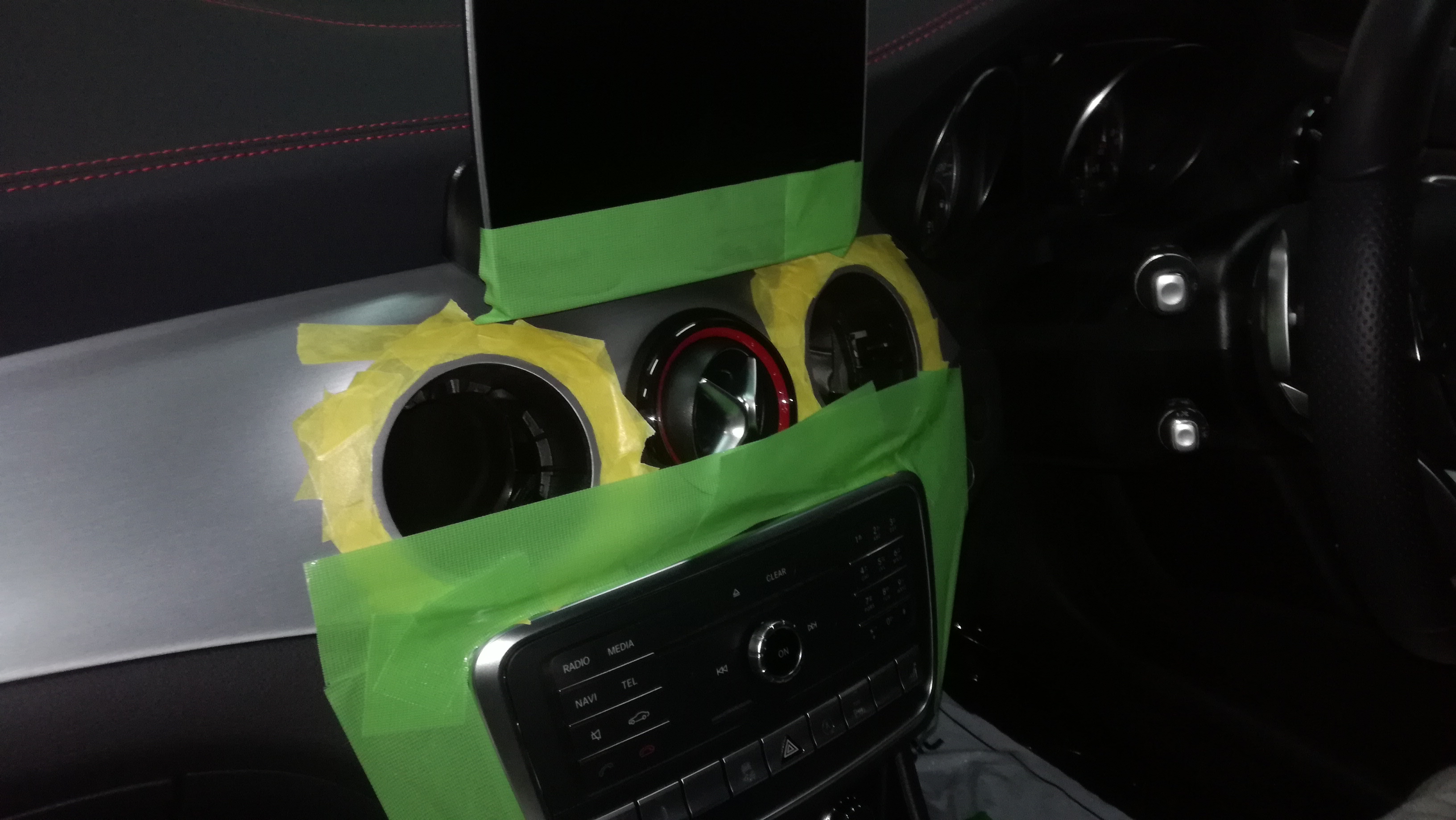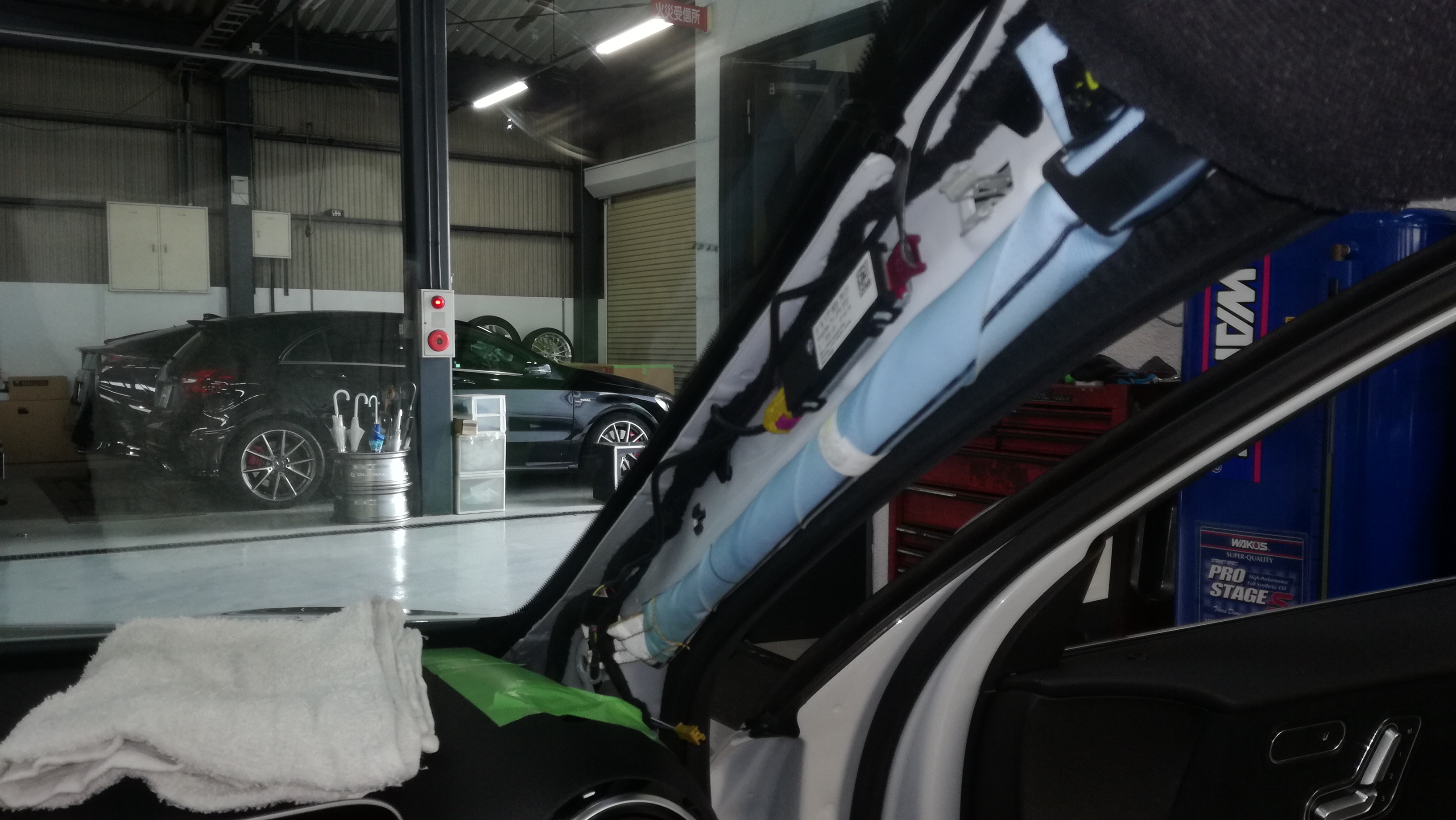作業にあたり養生からスタート、右フロントシート下での作業が必要になるのでシートの脱着