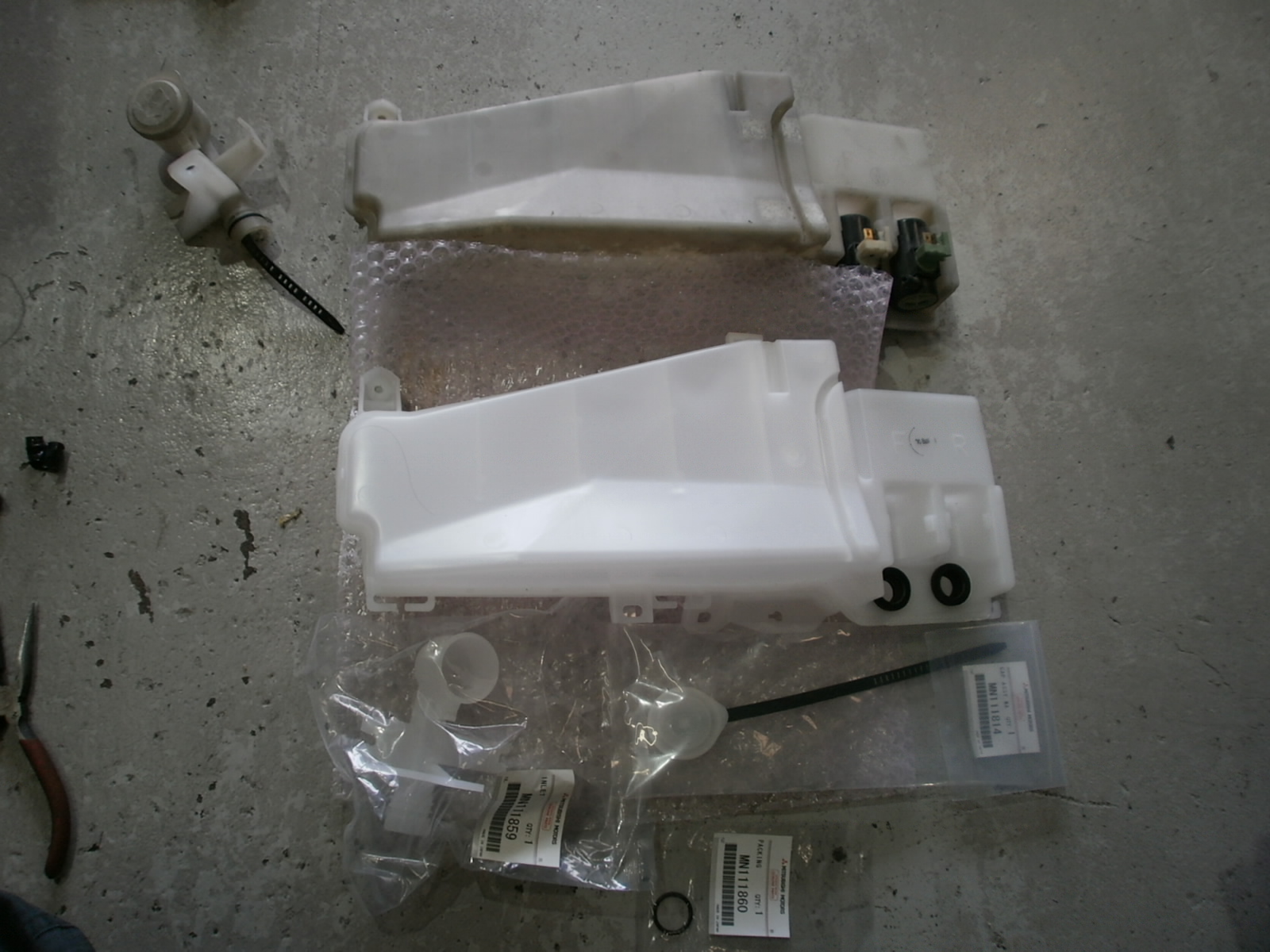 ウォッシャーからの出が悪く、点検すると劣化によりウォッシャータンクから水漏れが生じておりました。部品入荷いたしましたので、本日作業させていただきました。