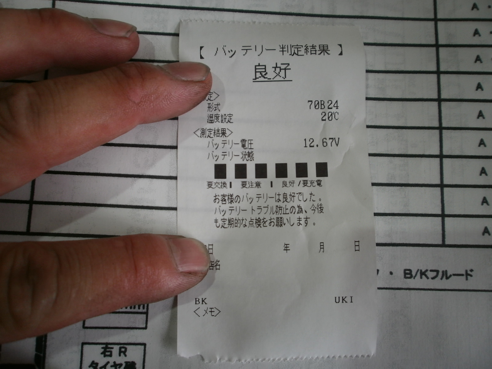 バッテリー出力点検、良好です。定期的な交換、エンジンオイル・ブレーキオイルも交換させていただきました。