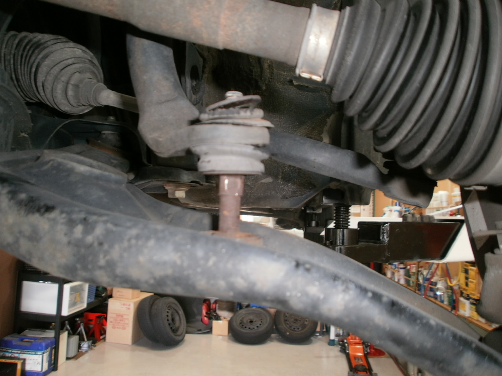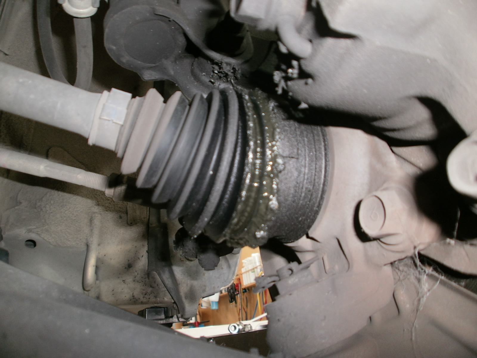 お、右フロント・スタビライザ・リンクのブッシュ破れを発見。グリース漏れしております。これでは車検も不合格となりますので、交換になるのですが、ブーツのみの部品設定が無く、スタビリンクでの交換となります。