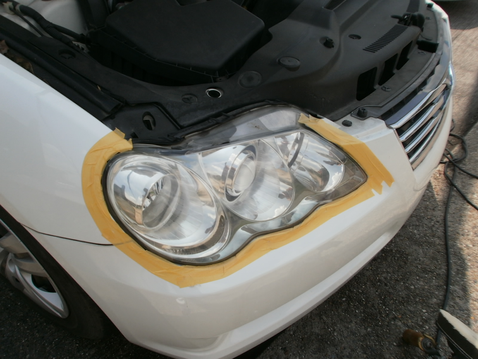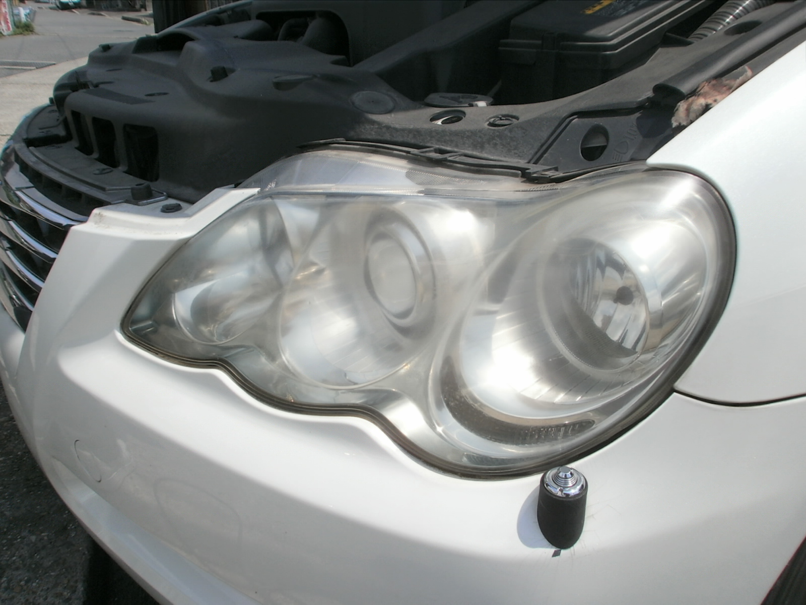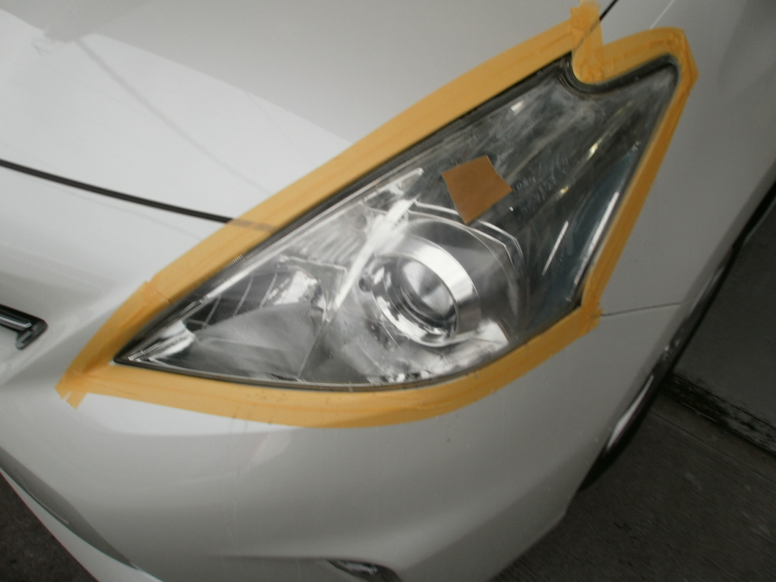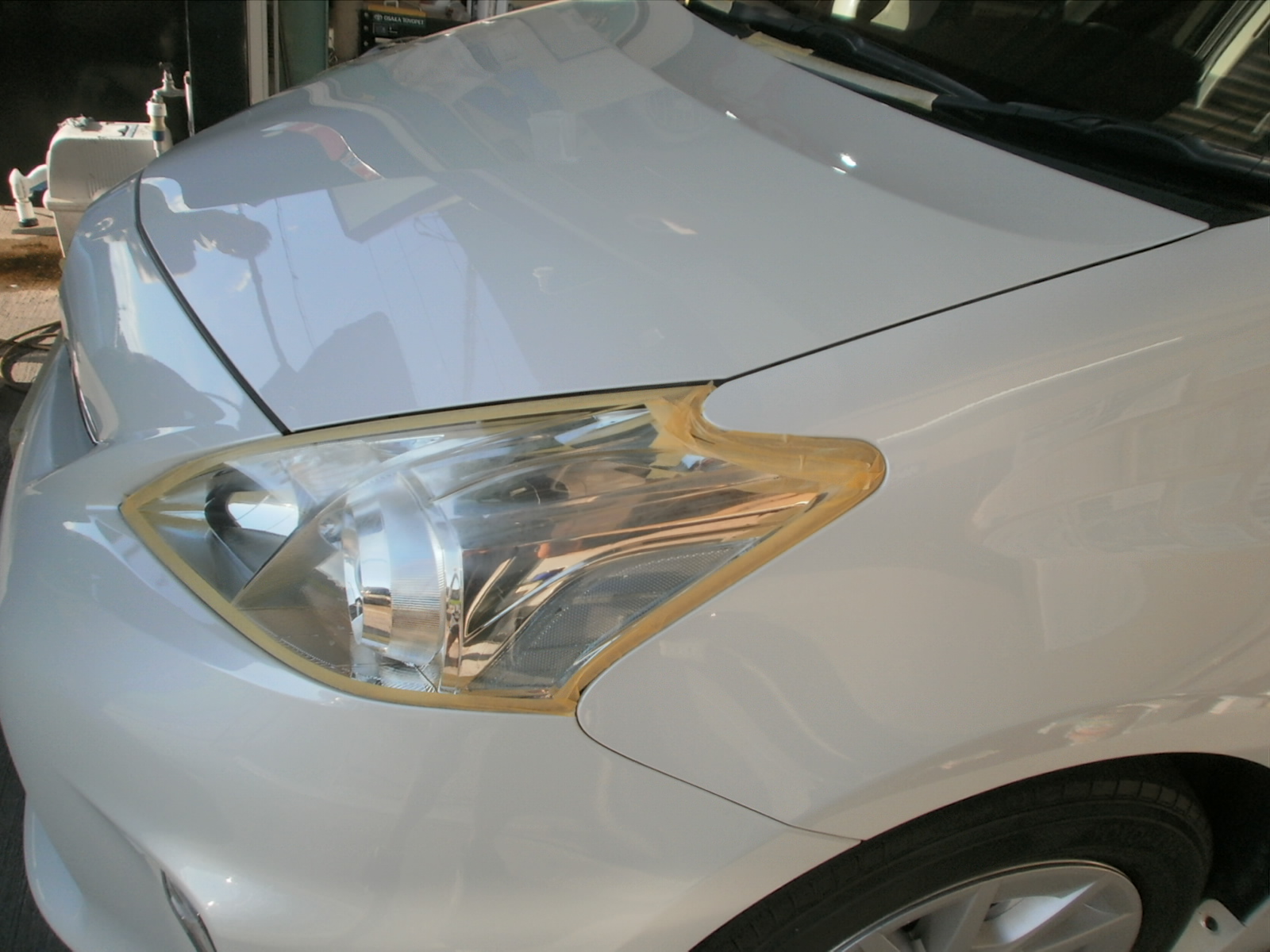 ヘッドライトの傷や曇り、黄ばみを除去中。